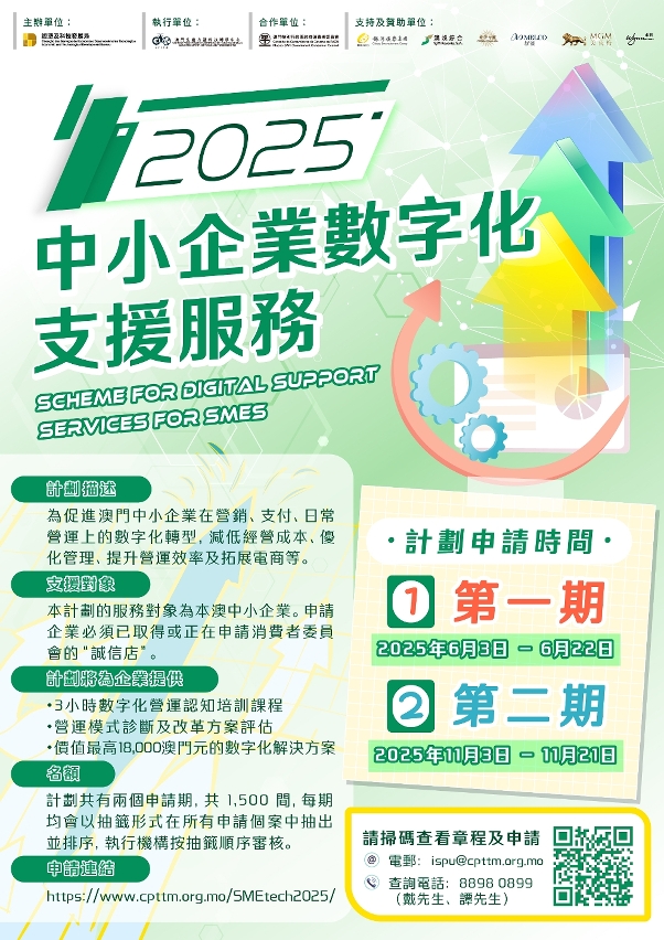 有意申請企業可透過掃瞄海報二維碼或於網上(https://www.cpttm.org.mo/smetech2025/)進行申請,並可參閱網頁了解認可供應商提供的方案。如有任何查詢,歡迎致電8898 0899(戴先生/鄭小姐)或電郵至ispu@cpttm.org.mo與生產力中心聯繫。