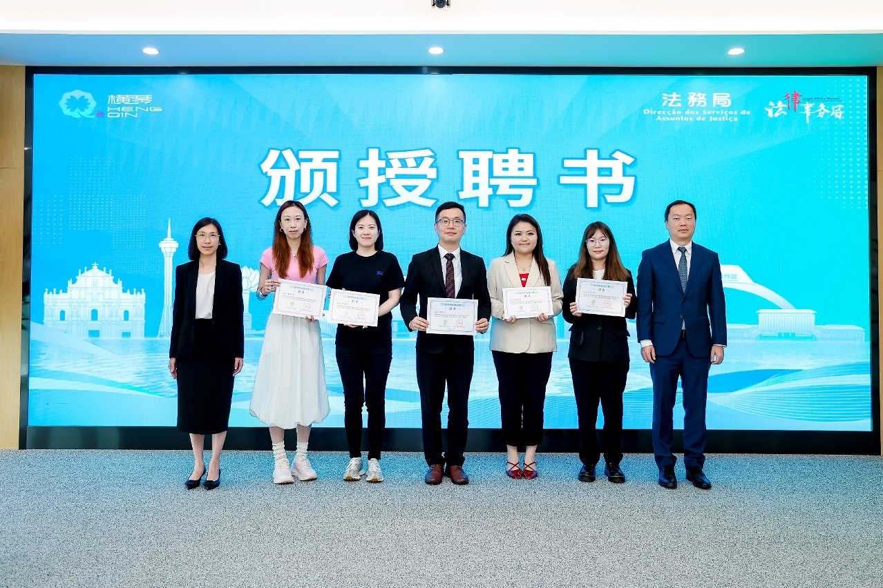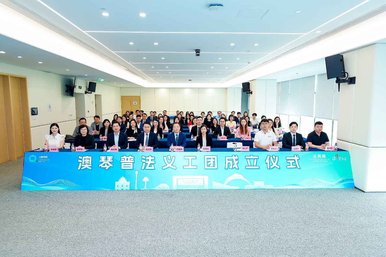 由澳門特別行政區政府法務局與橫琴粵澳深度合作區法律事務局共同籌組的“澳琴普法義工團”於今(14日)舉行成立儀式,首批義工團團員來自澳琴兩地的13個社團,共68人。儀式上,經團員們投票選出團長高嘉仁,副團長林美芳、莫美欣、黃淑筠和盧綺嵐。