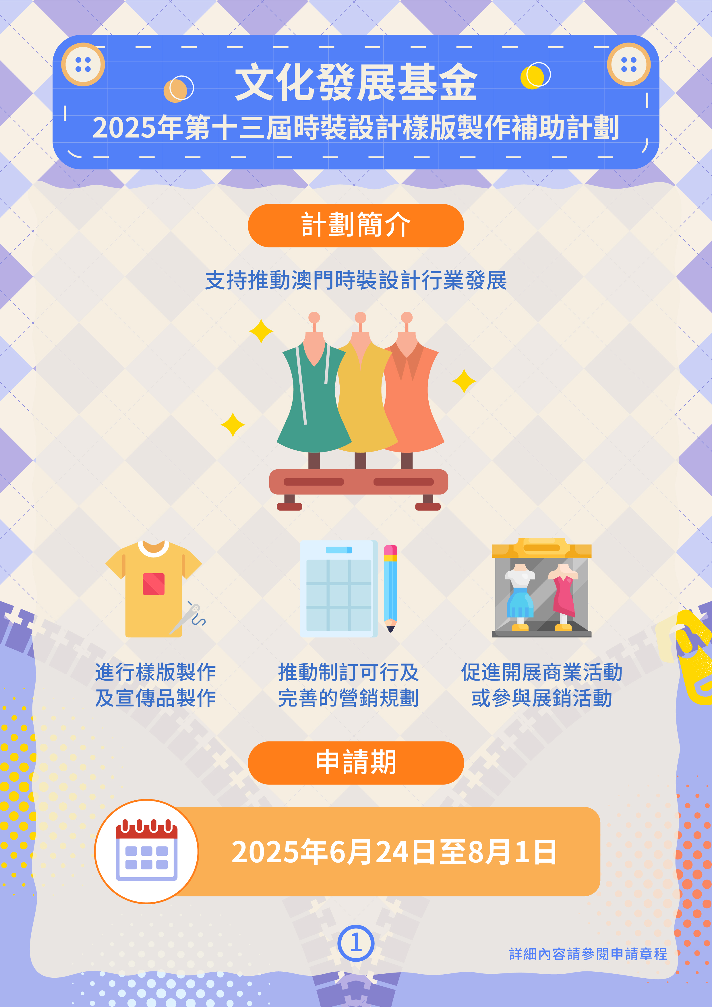 文化發展基金將於6月24日至8月1日接受“第十三屆時裝設計樣版製作補助計劃”的申請,為本地時裝設計師的原創時裝系列作品的樣版製作及宣傳推廣提供支持,持續推進澳門時裝設計行業發展。