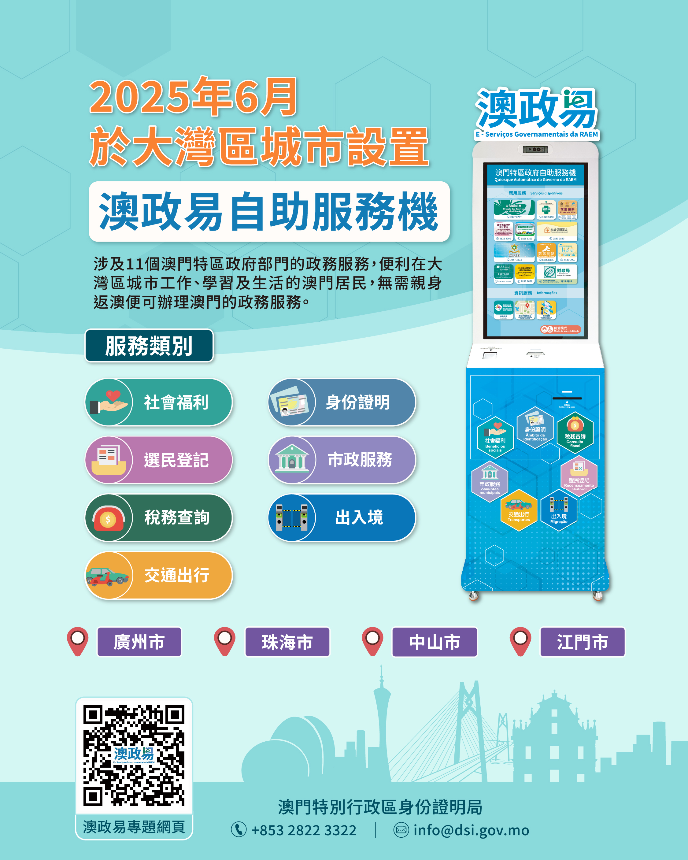為貫徹落實《粵港澳大灣區發展規劃綱要》,澳門特別行政區政府與廣東省政府積極協作,以實現高頻政務服務事項“跨境通辦”為目標,推動兩地政務服務深度融合,今(30日)起在四個大灣區內地城市(廣州市、珠海市、中山市及江門市)設置澳門特區政府“澳政易”自助服務機,以便利在灣區生活、工作、創業及發展的澳門居民,無需回澳便可辦理澳門的政務服務,致力打造大灣區宜業、宜居、宜遊的優質生活圈。