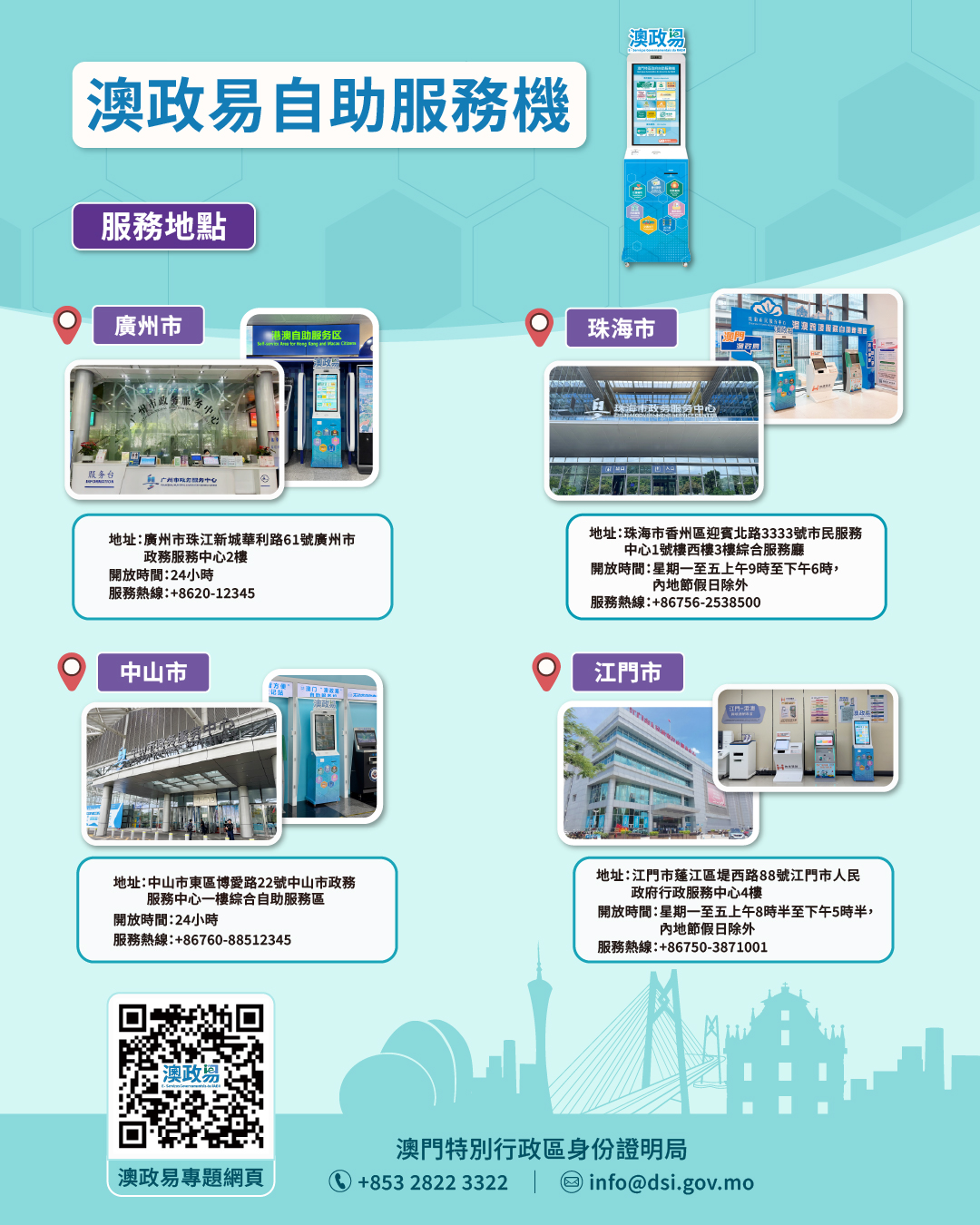 有關“澳政易”自助服務機詳情,請瀏覽“澳政易”專題網頁:https://www.dsi.gov.mo/mo-eservice/。有關“跨境通辦”專區,請瀏覽廣東政務服務網“跨境通辦”網頁:https://apps.gdzwfw.gov.cn/kytb-hk/#/。