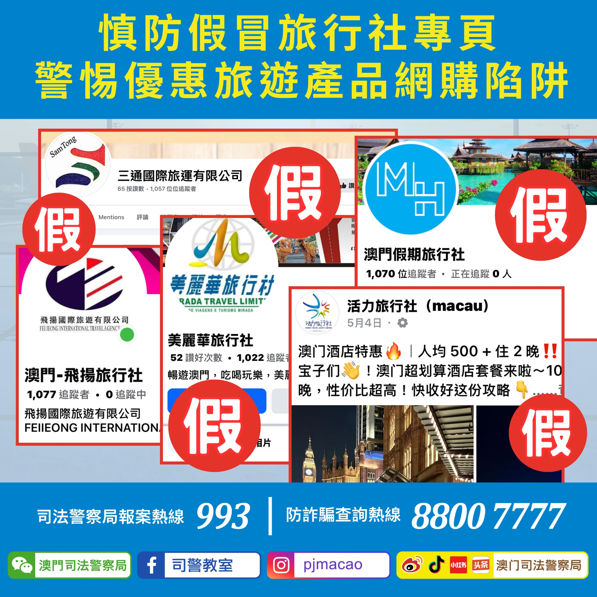 近日司法警察局發現騙徒於Facebook 假冒「活力旅行社」、「美麗華旅行社」、「飛揚旅行社」、「澳門假期旅行社」、「三通國際旅運」等專頁發佈廣告,企圖以優惠價促銷自助餐券、酒店客房等旅遊產品誘騙市民以「先付款、後取貨」進行交易,並以假冒旅行社名義開設且未經認證的MPay二維碼收款,當市民付款後騙徒將會隨即失聯。