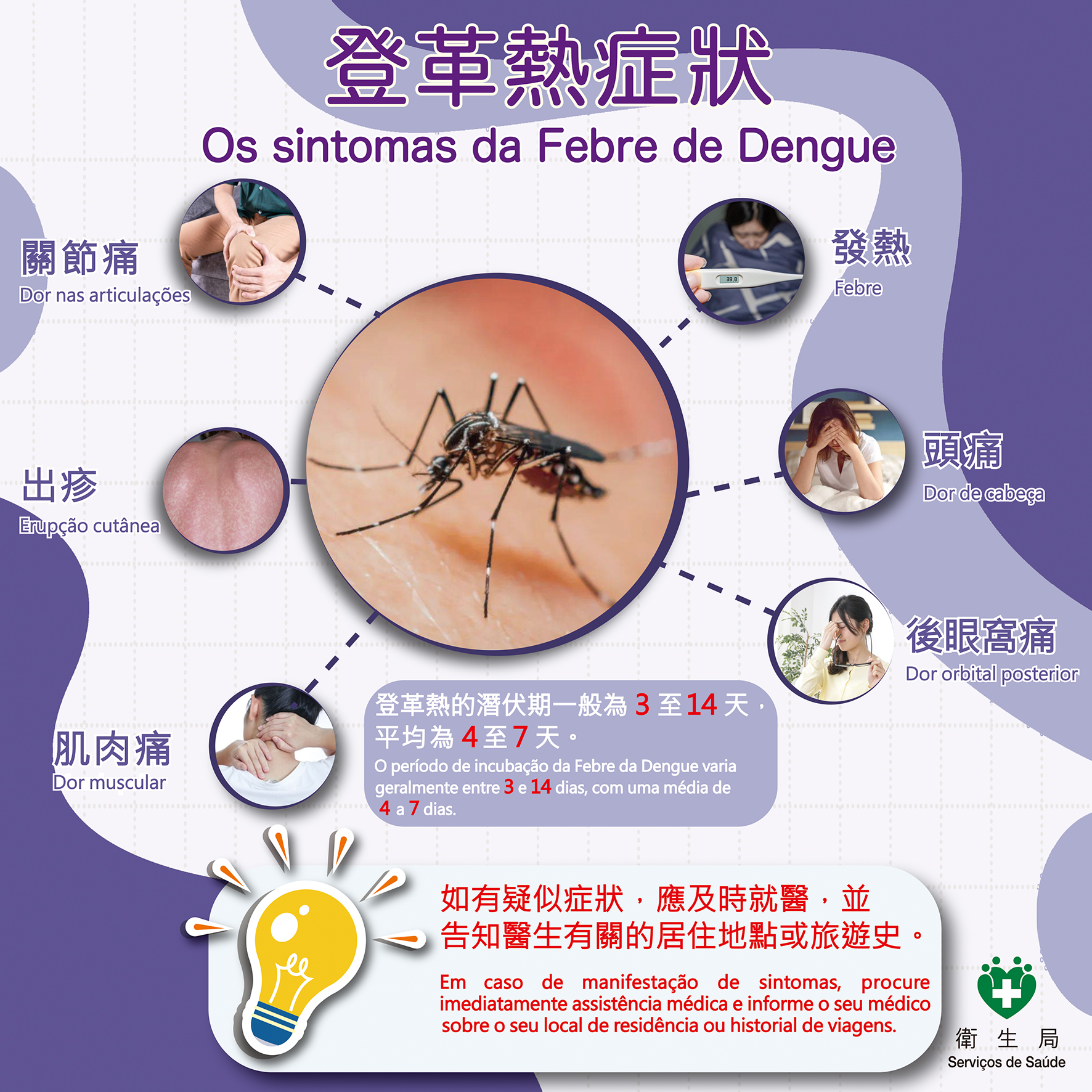 登革熱是通過帶病毒的白紋伊蚊叮咬人而傳播,早期症狀包括發熱、頭痛、眼眶後疼痛和肌肉關節痛等,數日後可能會出現皮膚發紅或皮疹。大部分登革熱病人可自行痊癒,但有少數患者可能出現嚴重出血或休克等併發症,故不應輕視。居民如出現上述疑似登革熱的症狀應及時就醫。衛生局同時提醒醫療人員留意疑似登革熱病例,如有懷疑應及時作出申報和檢測。衛生局公共衛生化驗所向本澳所有醫療機構提供登革熱免費檢測。