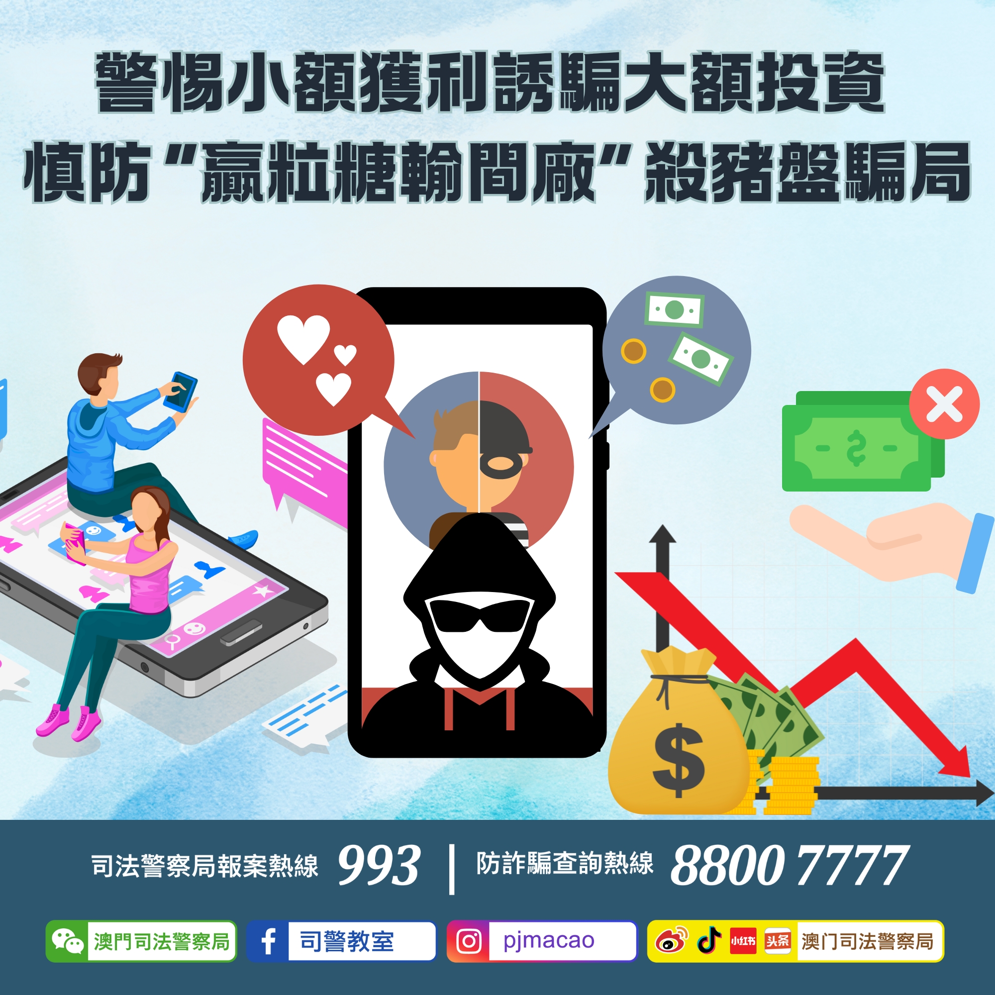 司法警察局自今年七月起已接獲8名市民檢舉,報稱遭遇俗稱"殺豬盤”的騙局,其中最高一宗損失金額更超過356萬澳門元。案情顯示,騙徒會先透過網上交友軟件與事主混熟並發展成網上戀人、又或在網上社交平台發佈廣告假扮投資專家等途徑取得事主信任,其後向事主推薦包括加密貨幣、股票組合、海外發展基金、網上投注等各類型聲稱“低風險、高回報”的賺錢項目,並發送虛假平台網站吸引事主投放資金。當事主按照騙徒指示轉帳或購買加密貨幣投放至指定帳戶,該虛假平台網站會顯示其獲利豐厚,但當事主欲提取款項卻被平台客服百般阻撓,甚至以需支付巨額手續費、稅款等理由要求繼續投放更多資金,事主始知被騙。