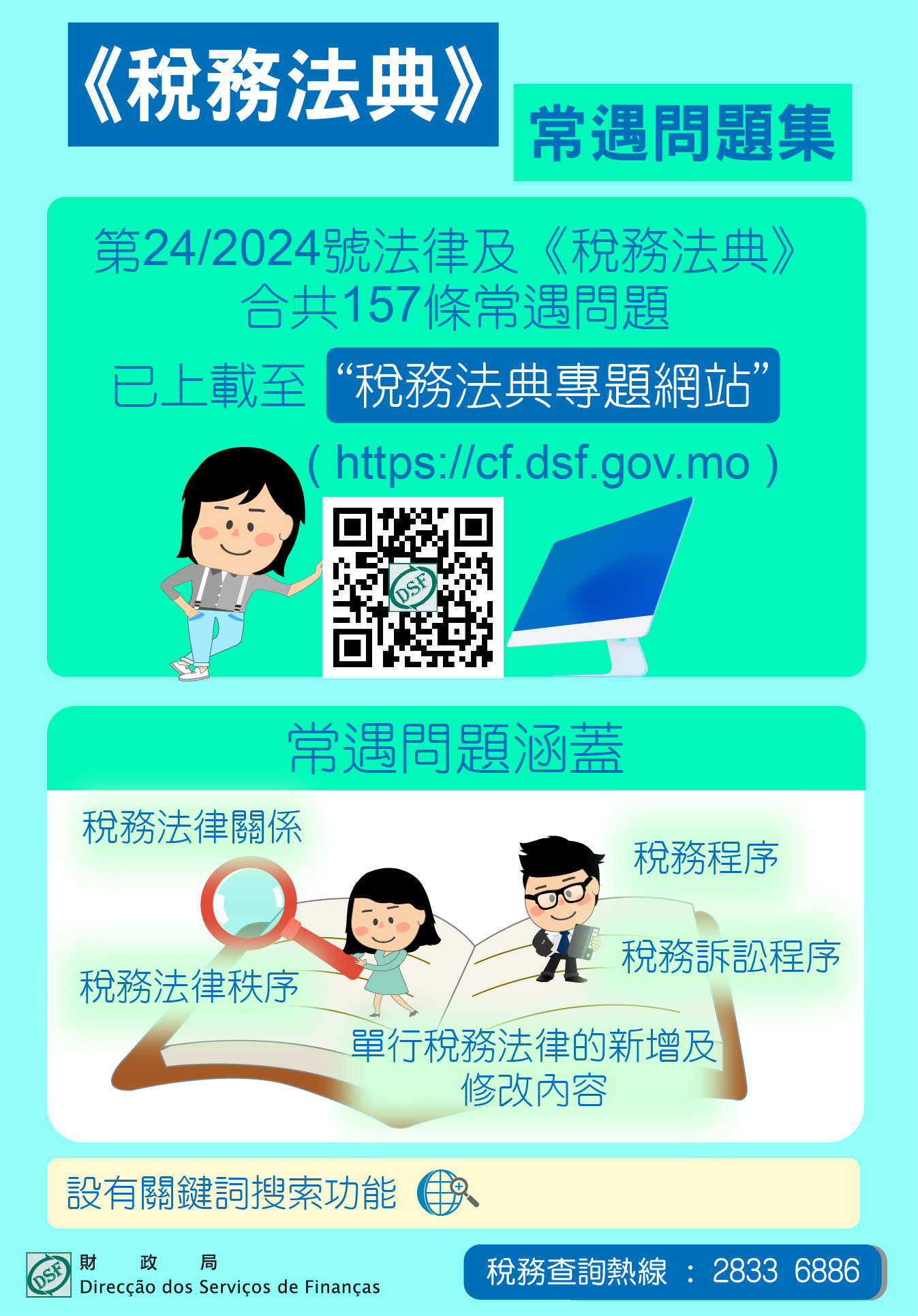 第24/2024號法律 -《核准〈稅務法典〉》將於明(2026)年1月1日起全面實施,為了加深居民對法典內容的了解,財政局已將《稅務法典》常遇問題輯錄成集,並上載至“稅務法典專題網站”( https://cf.dsf.gov.mo ),歡迎市民瀏覽。