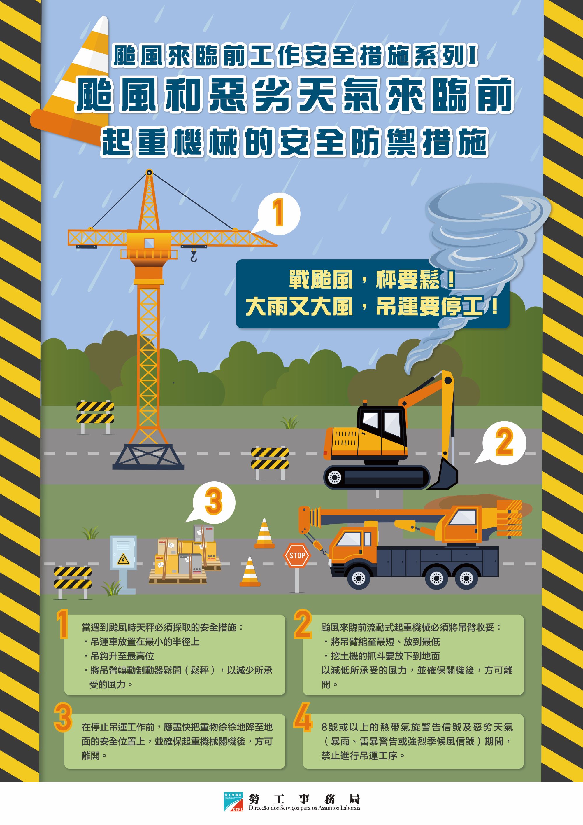 勞工局備有《熱帶氣旋、暴雨及特殊天氣等情況下的工作安全指引》及相關宣傳海報,歡迎巿民瀏覽和索取;如想了解更多職業安全健康的資訊,歡迎瀏覽勞工局「職安健天地」專題網頁(http://www.dsal.gov.mo/dsso/zh_tw/standard/index.html),或致電28717781查詢及親臨勞工局查詢。