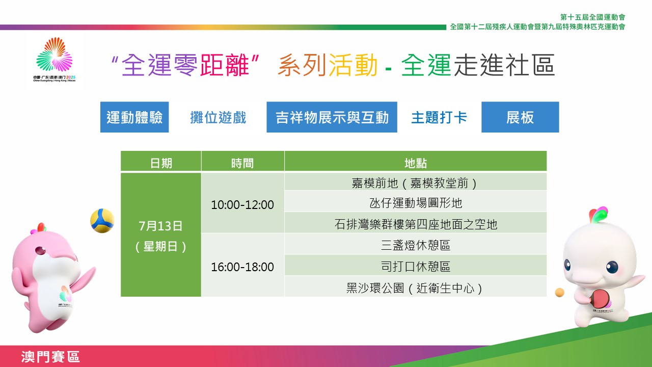 是次活動將在本澳不同社區舉行(時間和地點詳見下表),現場設有趣味攤位遊戲、全運會知識展板、吉祥物展示、主題打卡裝置等,參加活動者均有機會獲得十五運會和殘特奧會澳門賽區精美紀念品,誠邀大眾齊來感受全運魅力。