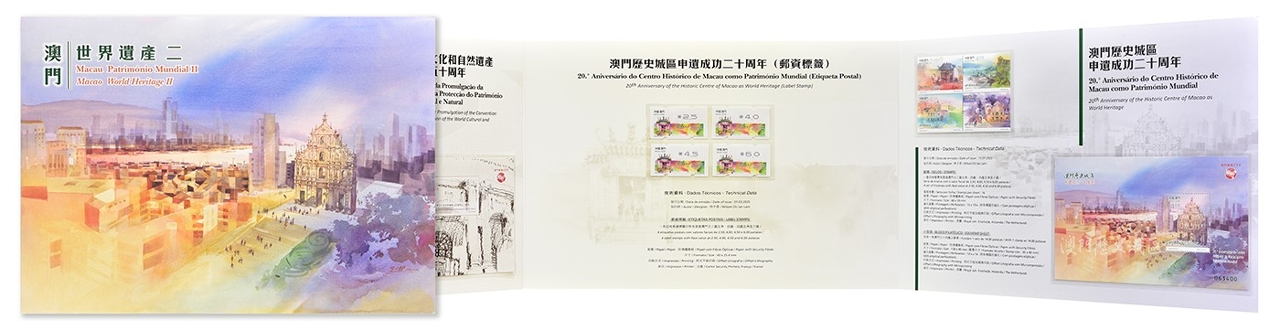 郵電局將於二零二五年七月十五日推出“澳門 世界遺產 二”專題郵摺,以慶祝澳門歷史城區申遺成功二十周年。