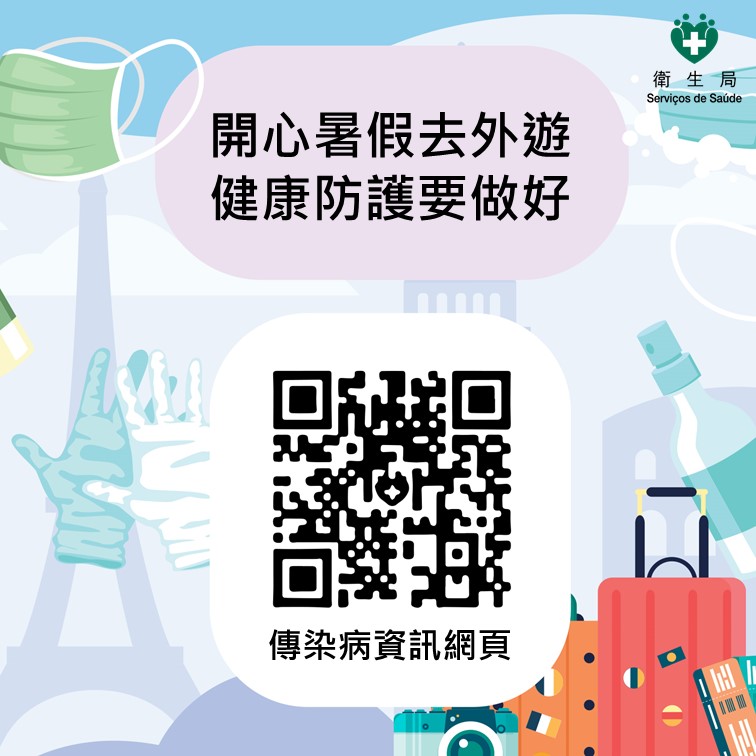 隨着暑假來臨,許多居民計劃外遊或出外探親。為確保旅途安全,讓居民安心享受假期並保障個人及家人的健康,衛生局提醒居民於外遊前做好防範疾病的準備,建議在出發前先查閱目的地有關傳染病流行情況、旅行期間做好防蚊措施、注意個人及食物衛生等,以降低感染登革熱、呼吸道傳染病及胃腸道疾病的風險。
