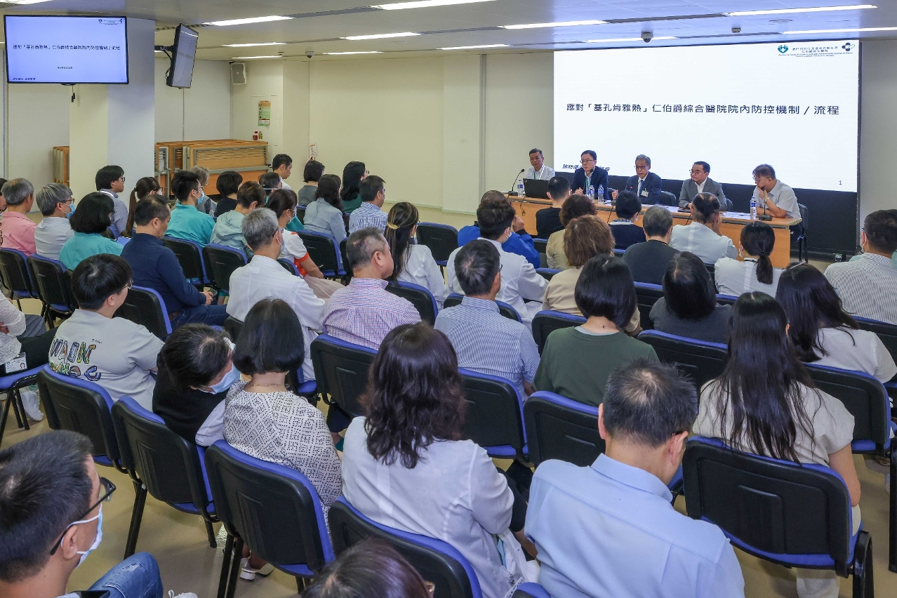 “防控基孔肯雅熱及登革熱”專題講解會向公私營醫療機構醫護人員詳細介紹了基孔肯雅熱和登革熱的流行現狀與風險評估、臨床表現、檢測指徵,疑似病例識別與通報流程,並特別強調醫護人員需提高對疑似病例的警覺性,以達致及早發現、及早通報。而“應對基孔肯雅熱院內防控機制流程”宣導會重點向仁伯爵綜合醫院醫護人員講解了病例住院期間需採取的防蚊措施、院內防控機制流程、防護與環境管理等,以確保發現疑似或確診病例時,能迅速及規範地啟動院內防控機制,從而儘早控制傳染源、保障社區安全。