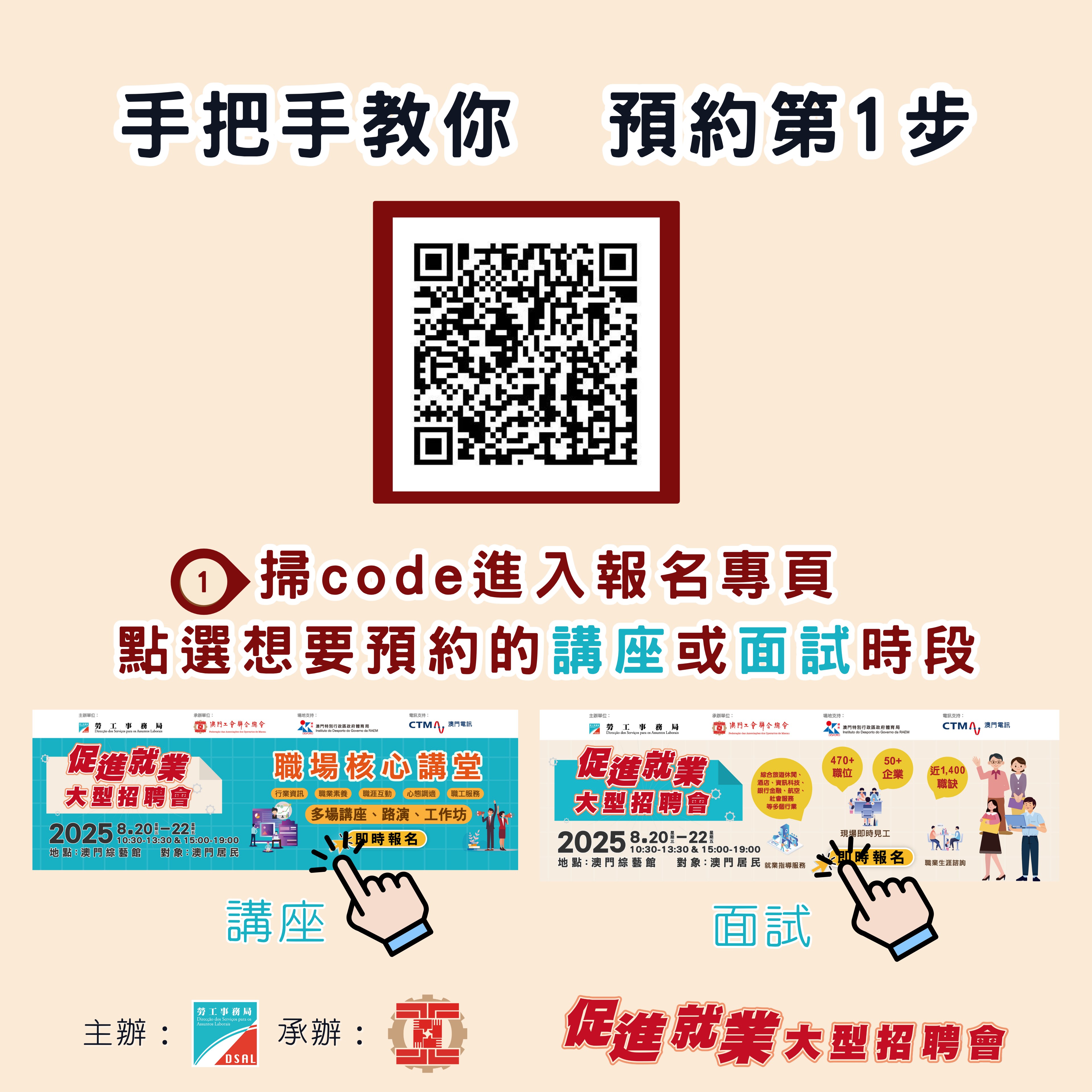 成功報名的澳門居民將收到確認短訊,屆時憑短訊簽到進場參與相關活動。活動設即場就業配對及應徵面試,參加者請帶備澳門居民身份證及個人履歷等面試所需文件,並穿著合適衣著前往現場。