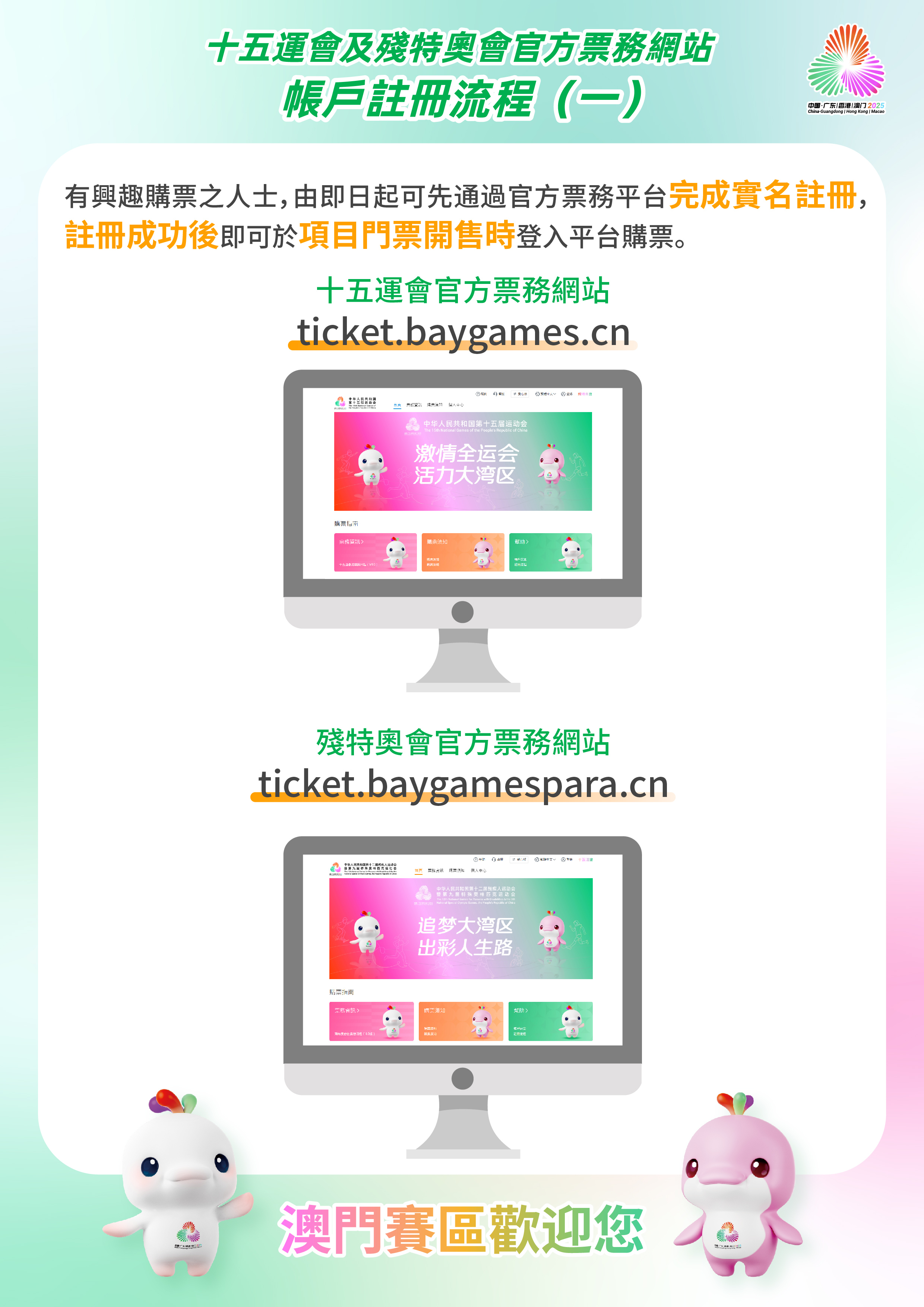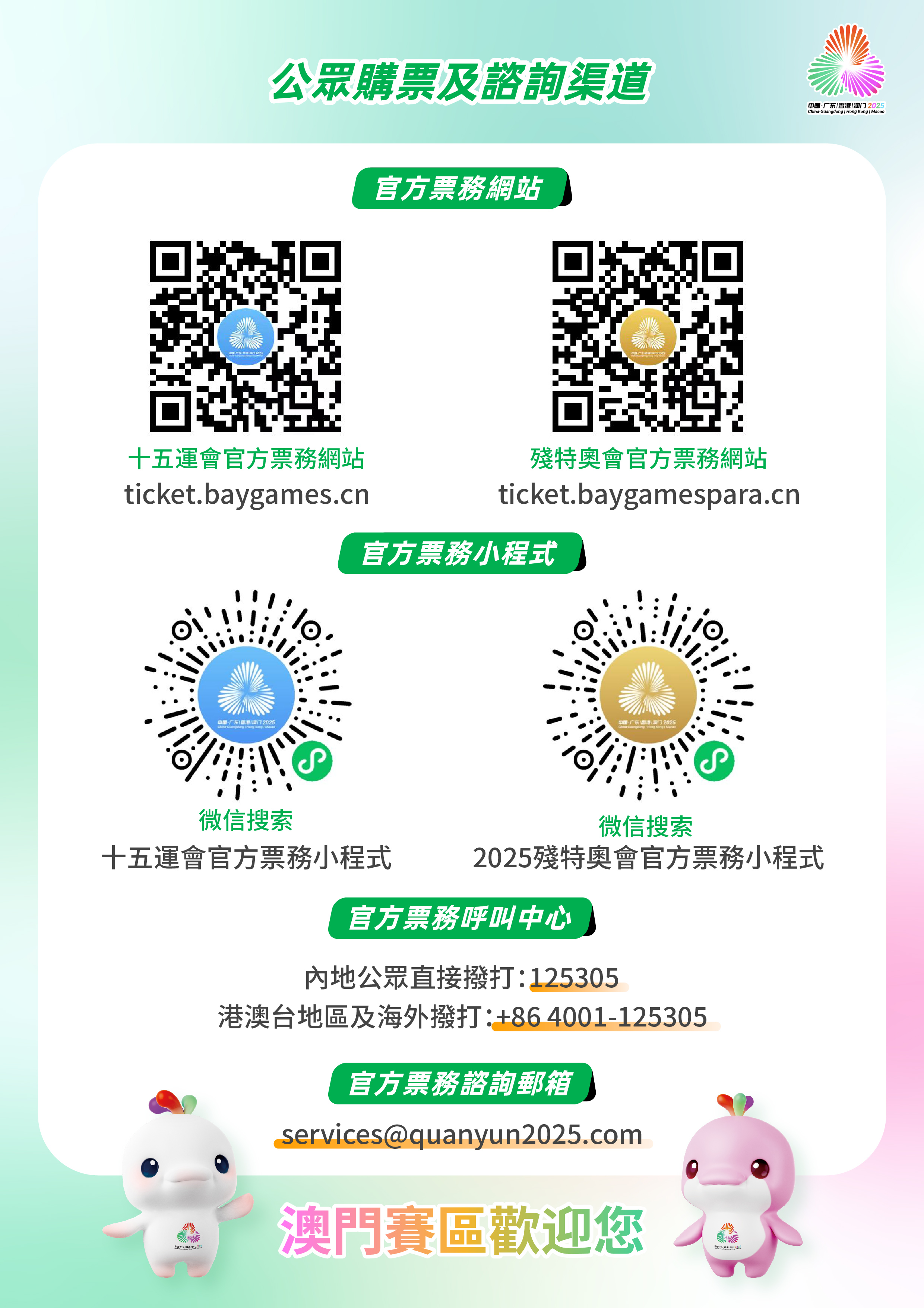 粵港澳三地首次實施“一個平台,三地購票”,有興趣購票之人士,由即日起可先通過官方票務網站或官方票務小程序完成實名註冊,註冊成功後即可於項目門票開售時登入平台購票,請各位體育迷留意相關賽區的門票須知及條款。為更好地服務購票公眾,十五運會和殘特奧會組委會設立票務呼叫中心,內地公眾可直接撥打125305,港澳台地區及海外可撥打+86 4001-125305,或電郵至services@quanyun2025.com查詢。