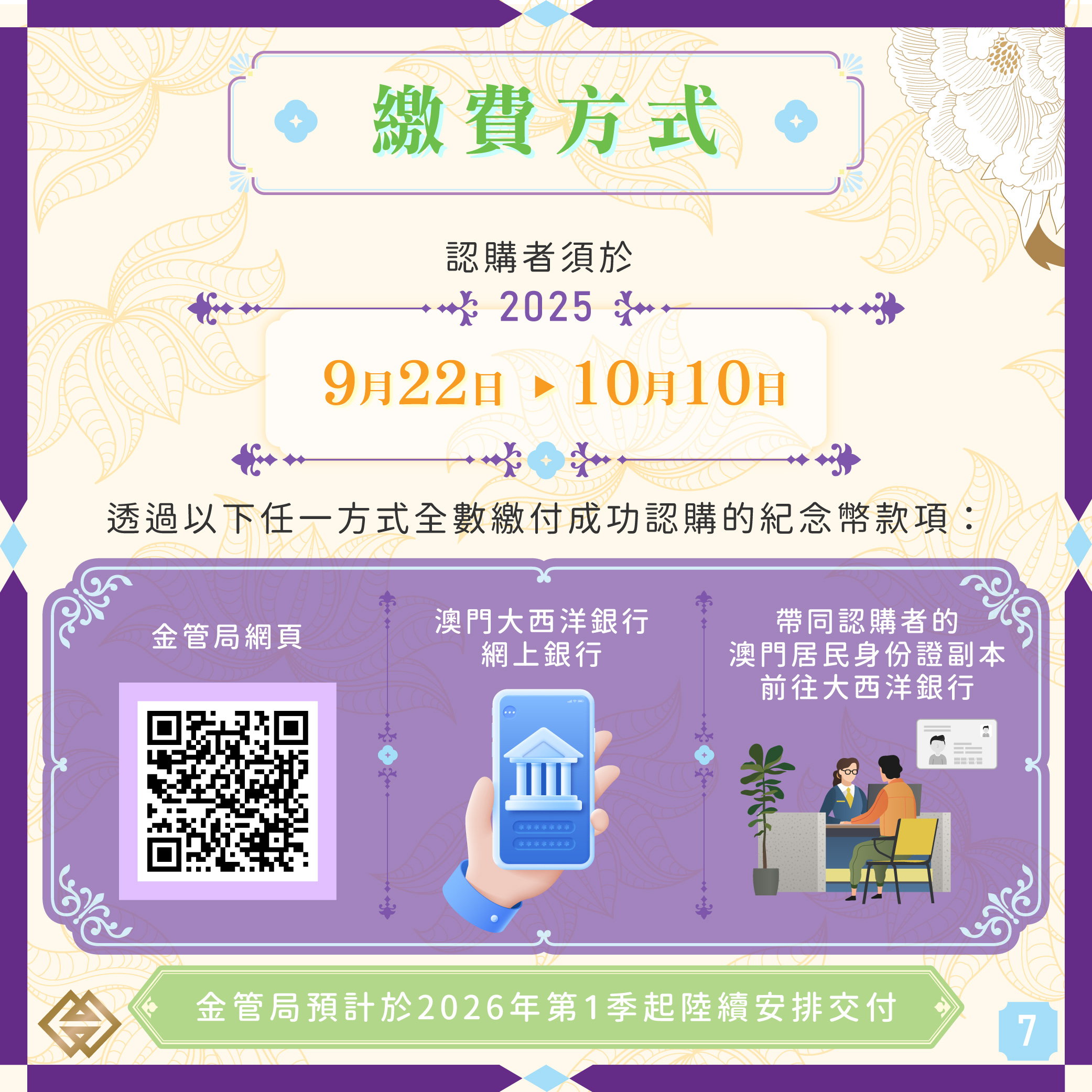 認購者須於9月22日至10月10日期間,可透過線上支付方式,經金管局網頁或澳門大西洋銀行網上銀行進行支付,亦可帶同認購者的澳門居民身份證副本前往澳門大西洋銀行分行,全數繳付成功認購的紀念幣款項。金管局預計於2026年第一季陸續安排紀念幣的交付。市民如欲瞭解紀念幣的登記認購程序等細節,可瀏覽金管局網頁,亦可致電2856 5071或2856 5072查詢。