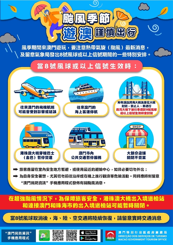 此外,旅遊局早前已透過工作會議及發函提醒業界有關颱風應注意的事宜及制定相關應對預案,並通知全澳酒店業場所於大堂或當眼位置展示澳門實時懸掛的熱帶氣旋信號及颱風期間澳門的交通措施安排。