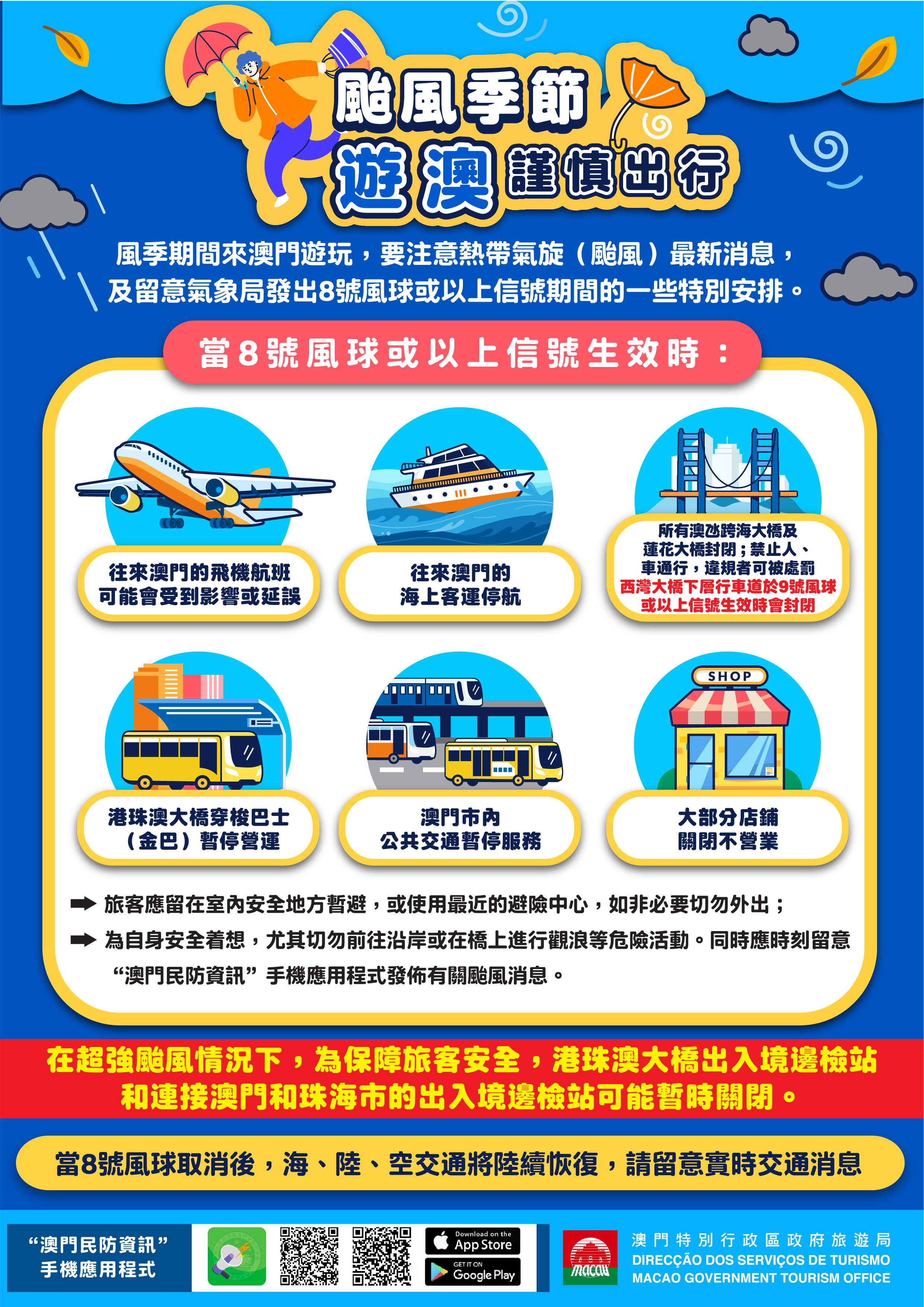 旅遊局各旅客詢問處已於當眼位置展示颱風資訊,並透過電訊公司向在澳門旅客及在外地旅遊的澳門居民發放民防相關資訊;旅遊局網頁及社交平台亦有轉載氣象相關資訊。旅遊熱線(2833 3000)24小時運作,旅客可隨時致電諮詢。