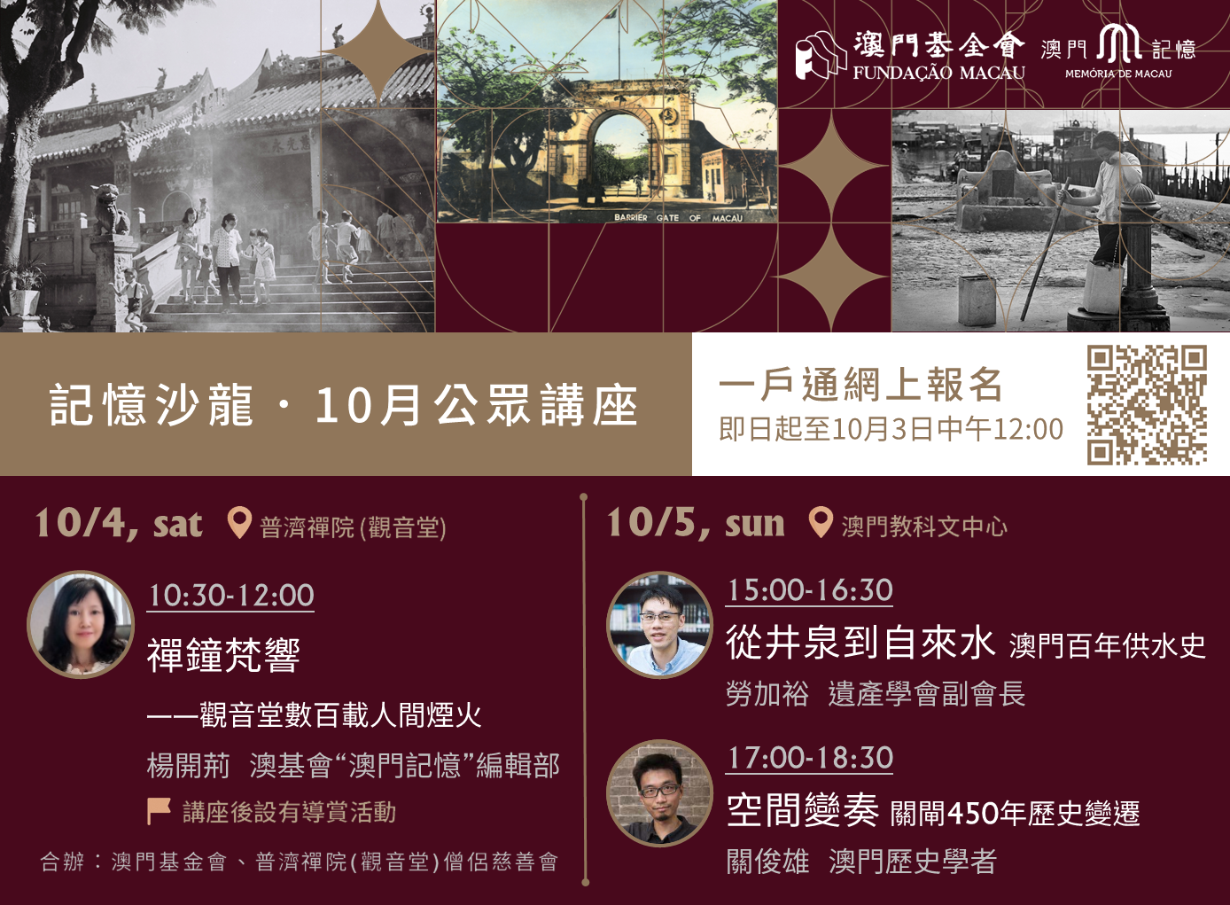 澳門基金會的“澳門記憶”文史網(www.MacauMemory.mo)開站六周年,自6月起每月為市民送上精彩系列活動,其中“記憶沙龍”公眾講座廣受市民歡迎。10月份“澳門記憶”壓軸推出三場全新主題的“記憶沙龍”,包括由澳門記憶編輯部楊開荊博士主講“禪鐘梵響──觀音堂數百載人間煙火”、遺產學會勞加裕副會長主講“從井泉到自來水:澳門百年供水史”,以及澳門歷史學者關俊雄主講“空間變奏:關閘450年歷史變遷”。