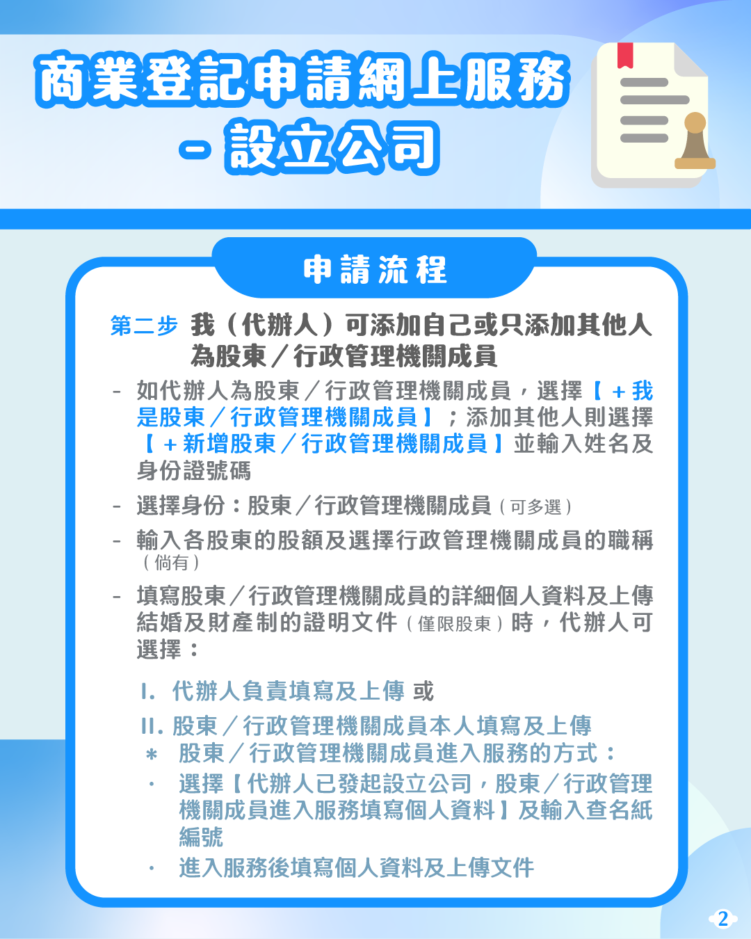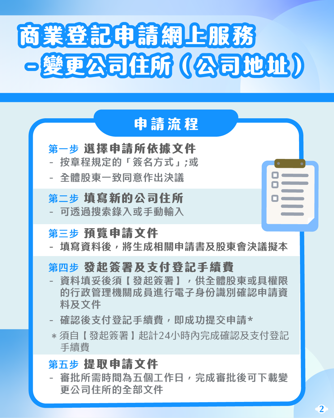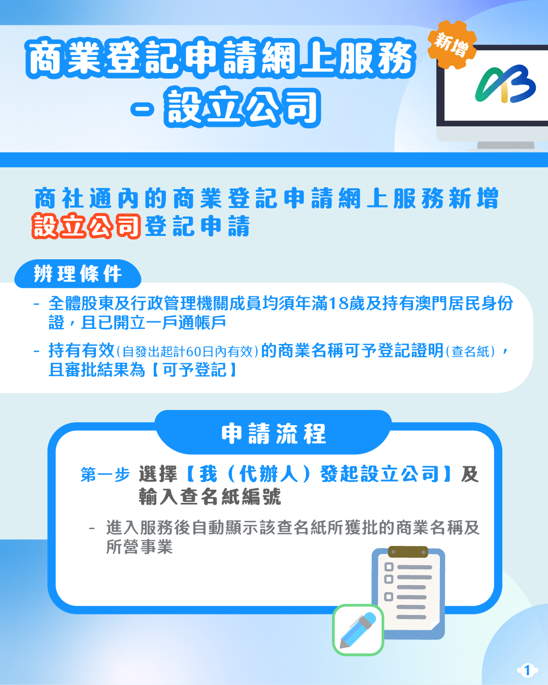 有意設立公司的人士可透過“商社通”提交公司設立的申請,並使用預設格式的線上文件模版製作公司設立的各類文件,無須再親臨公證署及登記局,即可輕鬆完成公司設立程序,提高企業開辦效率。此外,變更公司地址也可透過“商社通”辦理,包括提交申請、繳付登記費及取得登記副本,繼續實現指尖辦事模式,為用戶帶來最大便利。
