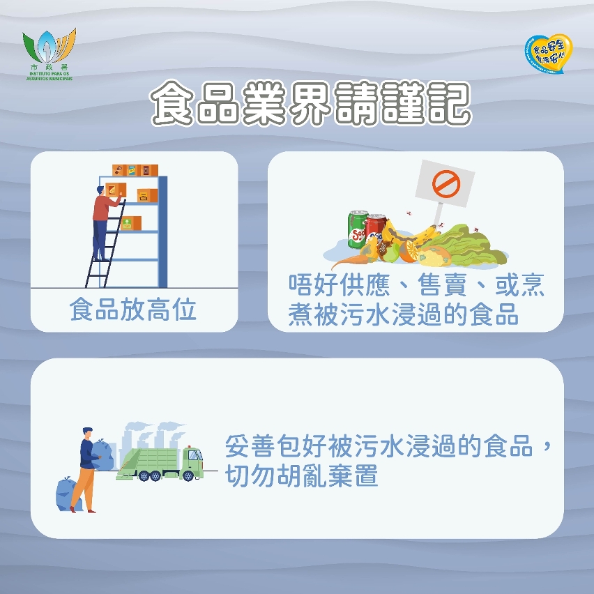 另外,食物及經營場所如受水浸或停電影響,切勿供應及出售廢棄、腐敗或變質的食品;並應採取適當的清潔消毒及善後措施。食品業界更要全力配合食安工作,妥善包好受水浸或停電影響而變質的食品,並直接自行運往焚化爐銷毀,切勿隨意堆放或棄置於街上,慎防他人撿拾,影響食品安全及公共衛生。市政署亦製作了“風季食安風險防範措施”專題網頁,歡迎市民及食品業界於食安資訊網(https://www.iam.gov.mo/foodsafety)查閱。