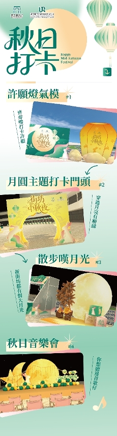 隨著新街坊社區漸趨成熟,生活配套設施完善,越來越多澳門居民選擇定居於新街坊。為與眾多居民一同迎接中秋,新街坊入口廣場將設置大型月亮拱門裝置,寓意「人月團圓」;此外,場內亦佈置多個中秋氛圍感濃厚的燈飾打卡點,讓街坊們沉浸式感受節日魅力。凡於活動當日在現場拍照打卡,並分享到指定社交媒體,即可領取限量精美禮品。