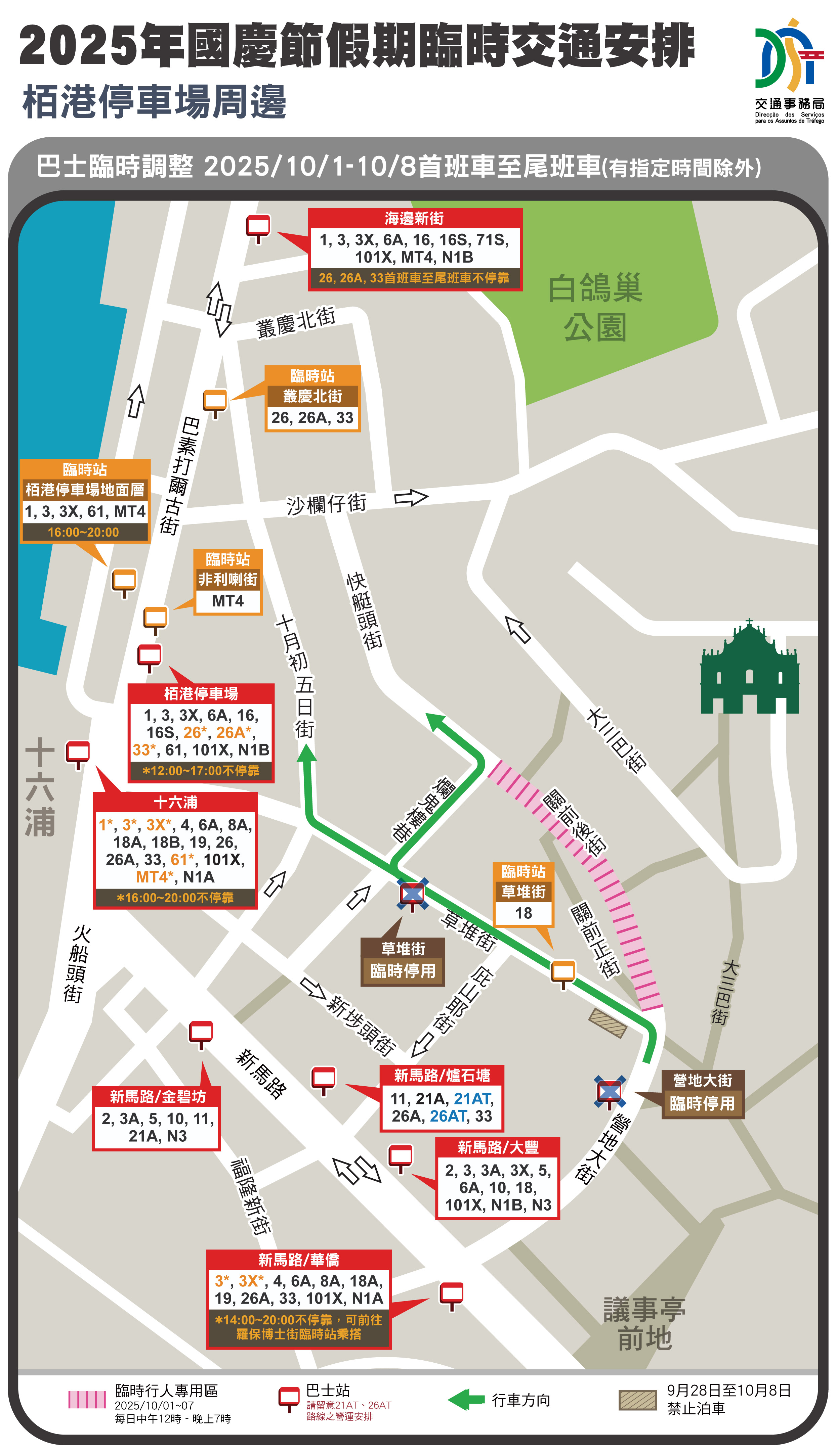 備註:澳門關前後街及氹仔舊城區設置臨時行人專用區的交通安排詳情:https://www.dsat.gov.mo/dsat/news_detail.aspx?a_id=2C2E03DFA02CB3B00896A613EF0A992C