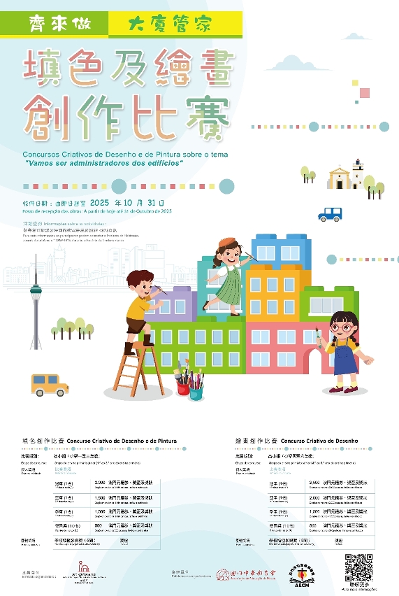 為提升學生對樓宇管理、保養和維修的認識,對居住環境的關注,由房屋局主辦、澳門中華教育會和澳門天主教學校聯會協辦的“齊來做大廈管家”填色及繪畫創作比賽即日起至10月31日接受報名,歡迎愛好畫畫的小學生踴躍報名參加。