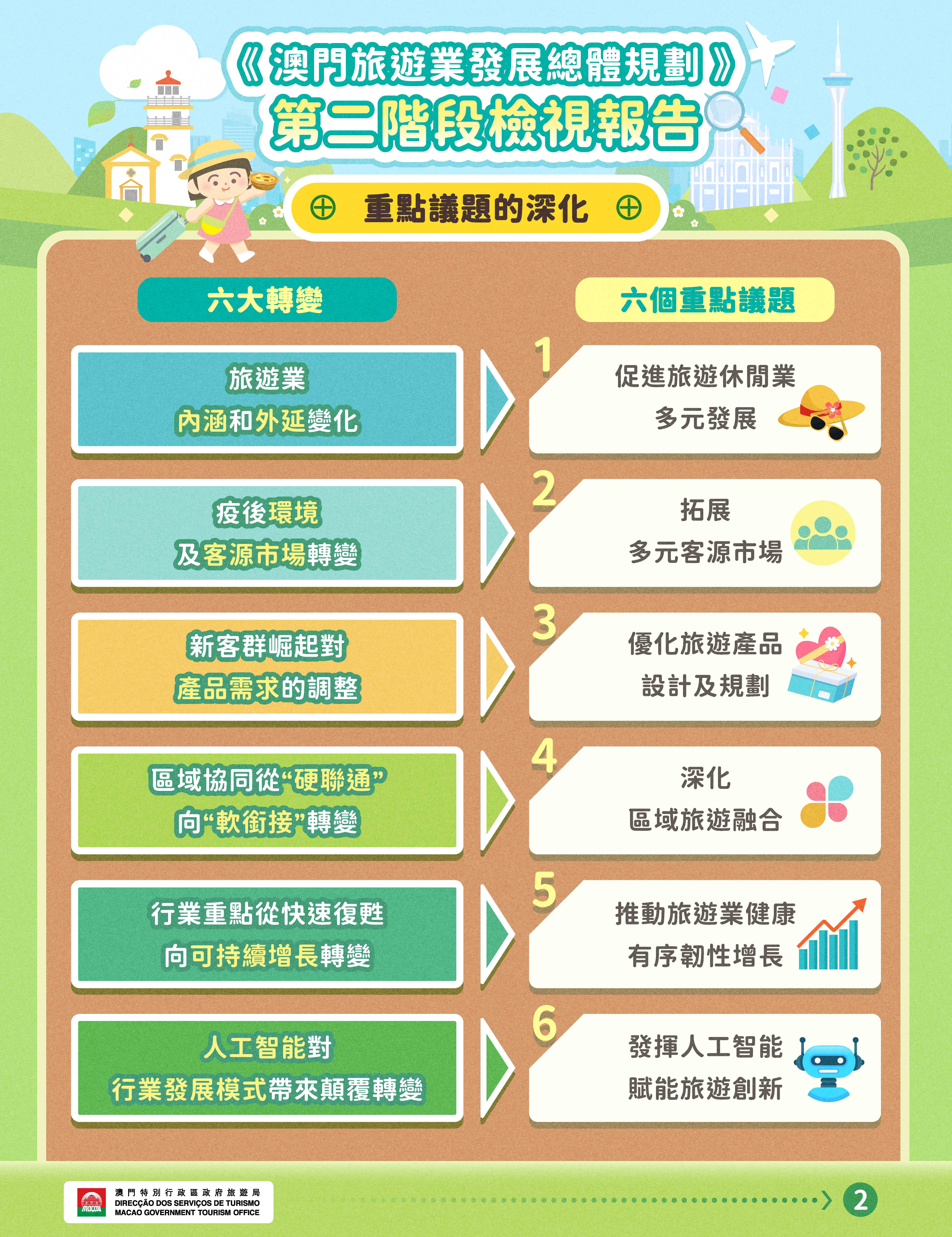《總體規劃》第二階段檢視研究內容主要包括:回顧2021至2024年的執行情況,並修訂2025至2030年的行動計劃及關鍵指標;分析澳門旅遊業發展狀況與趨勢;重點深化六大議題:促進旅遊休閒業多元發展、拓展多元客源市場、旅遊產品設計及規劃、深化區域旅遊融合、旅遊業健康有序韌性增長及人工智能賦能旅遊創新。