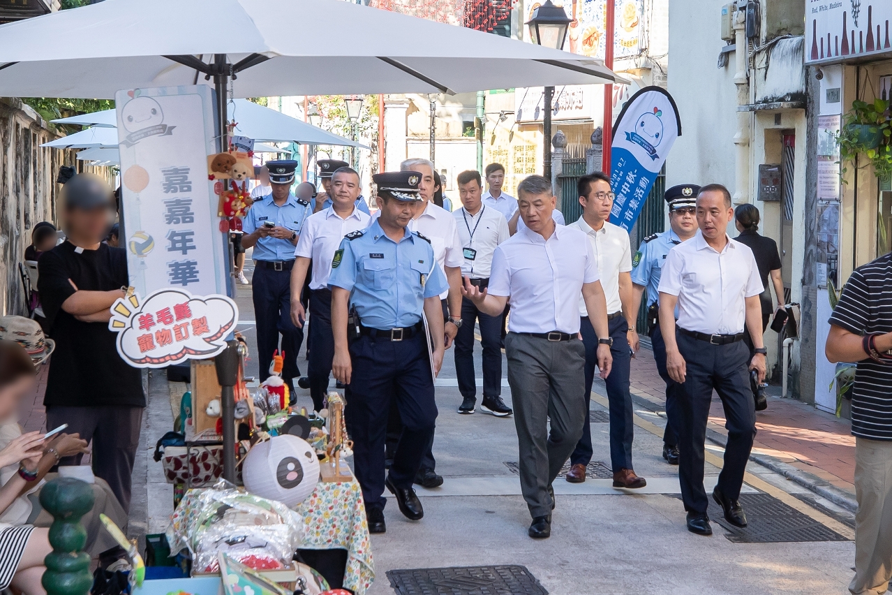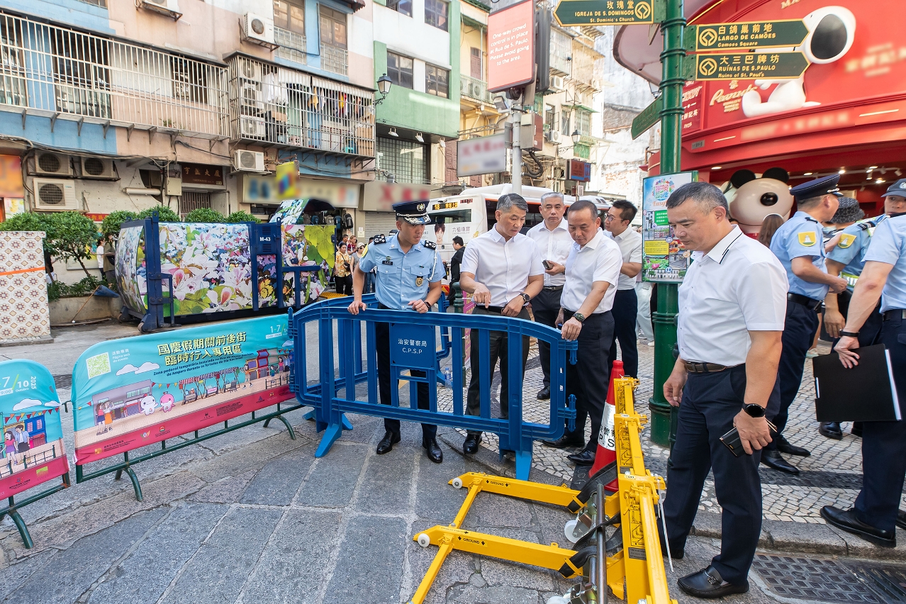為深入了解各前線部門在國慶節期間的工作執行情況,今日(3日),警察總局局長梁文昌率治安警察局局長吳錦華、保安部隊事務局局長劉運嫦、警察總局局長助理魏瑞斌、治安警察局副局長梁慶康、副局長伍素萍及相關部門主管,先後視察關閘、青茂及橫琴口岸,視察節假日人流及旅客通關情況;亦親臨澳門關前街及氹仔舊城區設置的臨時行人專用區,實地考察市面人流及相關措施的執行情況,並就各項警務部署作出指示。