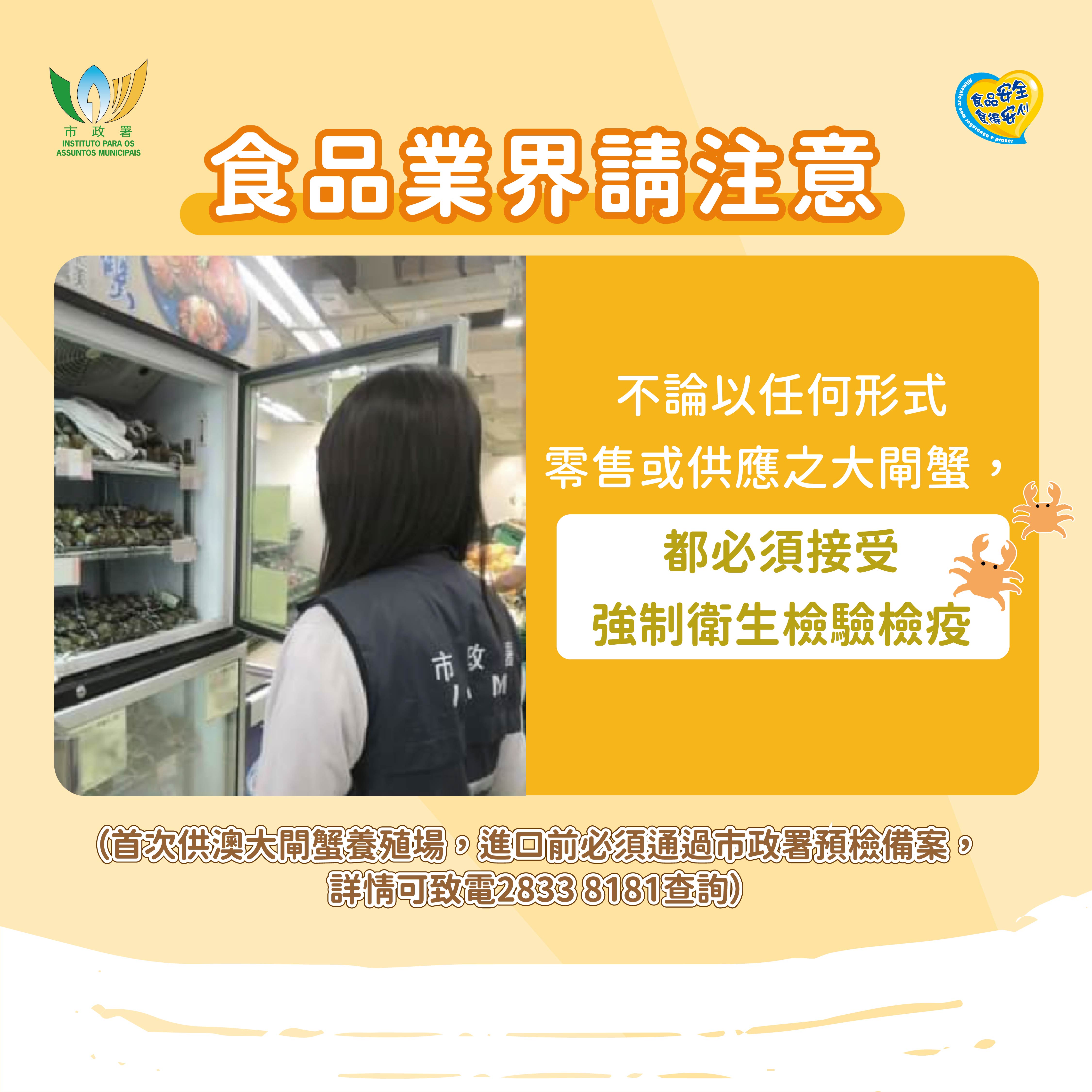 在大閘蟹品質安全監察方面,市政署與內地權限部門保持緊密聯繫,對供澳大閘蟹採取源頭監管、直接供澳措施。大閘蟹養殖場正式供貨到澳門前,須通過市政署預檢,並由來源場監管當局直接封簽才可輸澳。大閘蟹抵澳後須提交由產地官方發出的衛生證明文件及相關衛生檢疫資料供審核,並接受常規抽樣,經檢驗檢疫程序後才得以流入本澳市場。