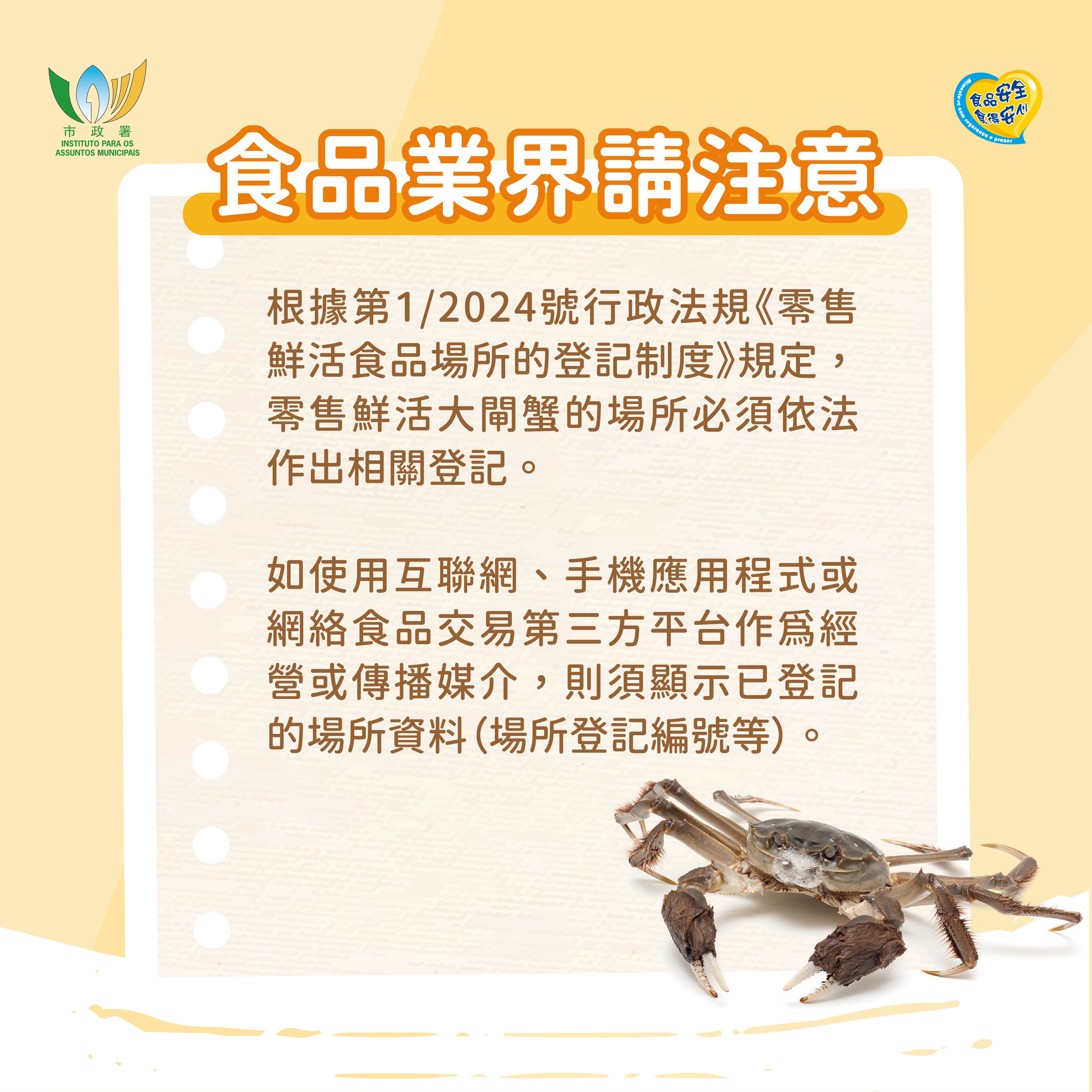 另外,《零售鮮活食品場所的登記制度》已經生效,所有零售大閘蟹等鮮活食品的場所都必須依法登記。如使用互聯網、社交平台或第三方交易平台等作為經營或宣傳媒介,須於該平台上顯示場所登記編號等資料,以供消費者識別。同時,市政署提醒消費者應到信譽良好及衛生可靠的店舖選購大閘蟹,並挑選生猛、無異味及外殼完整有光澤的蟹隻,網購大閘蟹亦須清楚瞭解貨品來源。