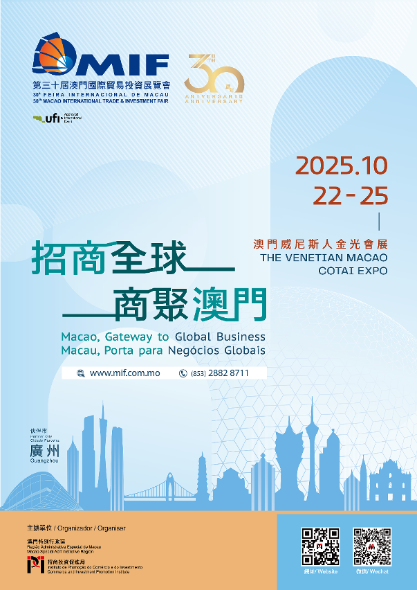 此外,第30屆MIF將與“第二屆中國—葡語國家經貿博覽會(澳門)"、“澳門國際品牌連鎖加盟展2025”及“粵港澳大灣區人才高質量發展大會”同期同場舉行,數展聯動實現資源疊加與效益最大化。如欲了解MIF最新資訊,可瀏覽大會網站:www.mif.com.mo,或致電(853)2882 8711,亦歡迎關注微信號:MICE_IPIM。