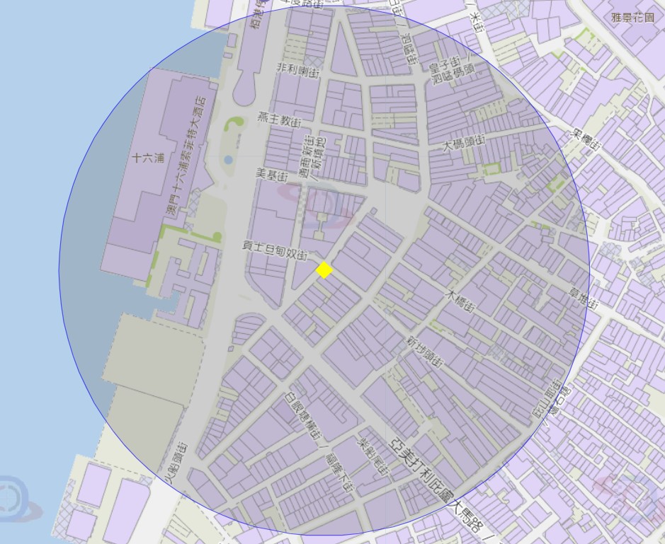 爹美刁施拿地大馬路(近新馬路一段)附近風險區域200米半徑範圍