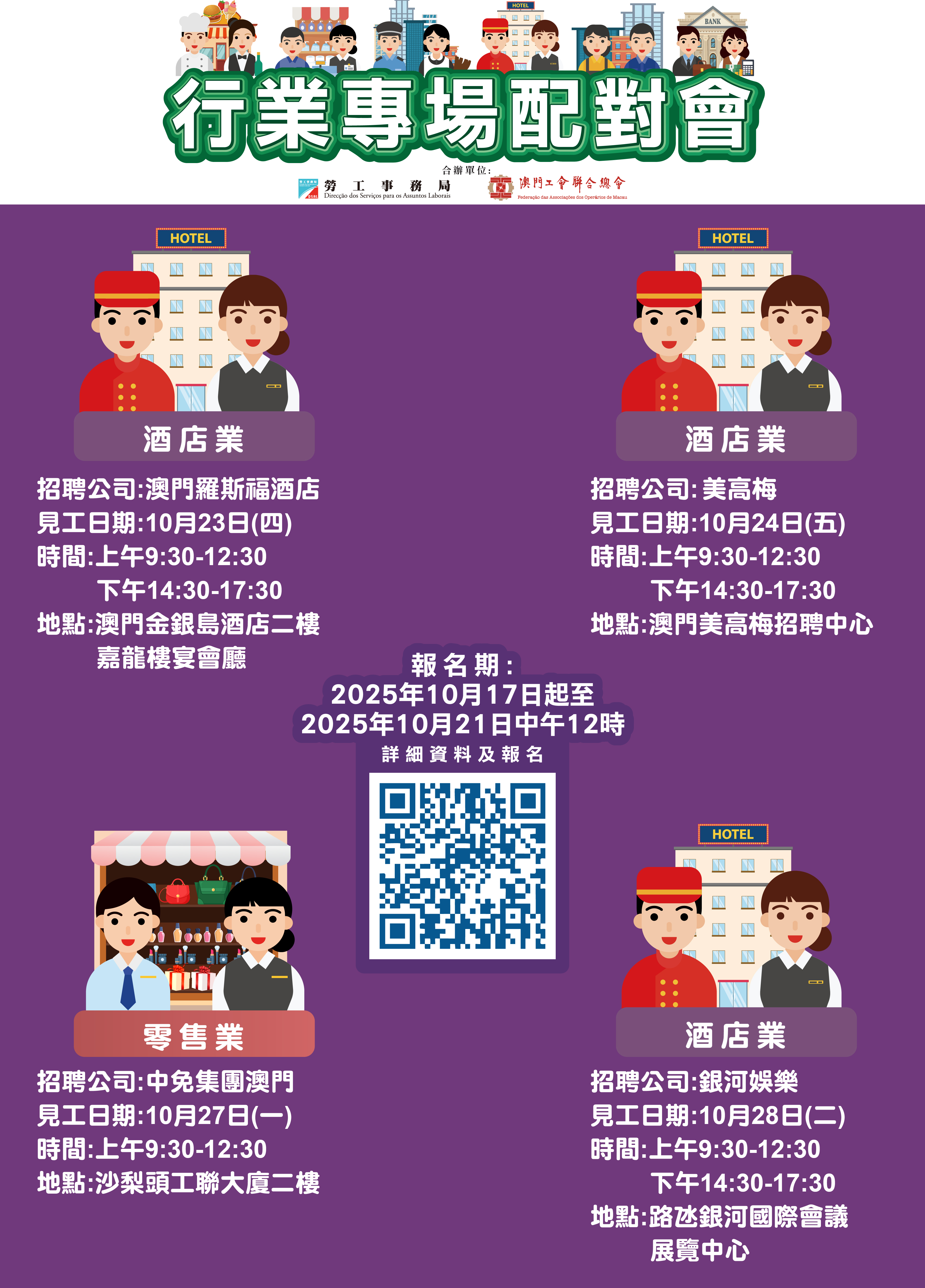 10月23日「澳門羅斯福酒店有限公司」專場配對會在澳門金銀島酒店二樓嘉龍樓宴會廳舉行;10月24日「美高梅金殿超濠股份有限公司」專場配對會在澳門美高梅招聘中心舉行;10月27日「中免集團澳門一人有限公司」專場配對會在澳門工會聯合總會二樓(沙梨頭海邊街2-6號工聯大廈二樓)舉行;10月28日「新銀河娛樂2006有限公司」專場配對會在澳門銀河國際會議中心。報名期10月17日起至10月21日中午12時。