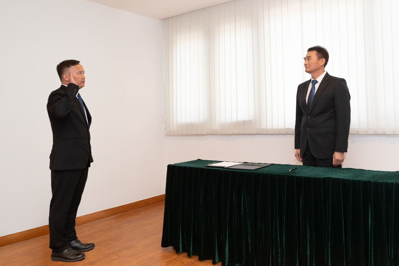 懲教管理局於2025年10月17日舉行新任主管人員就職儀式,由程况明局長監誓,並在李日明副局長和各部門主管見證下,維修及保養處處長李家能宣誓就任。
