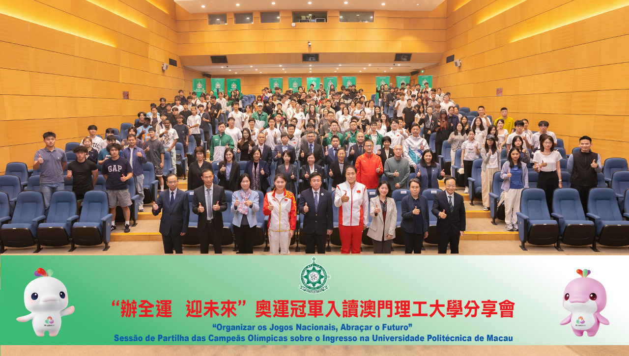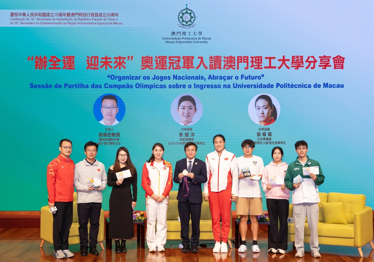 為慶祝中華人民共和國成立76周年暨澳門特別行政區成立26周年及第十五屆全國運動會舉辦之際,澳門理工大學舉辦“辦全運•迎未來—奧運冠軍入讀澳門理工大學分享會”。分享會以“與奧運冠軍共話體育精神,點燃青春力量”為主題,由澳門理工大學學生、奧運金牌得主焦劉洋及張楊楊主講,分享以體育為橋梁,助力粵港澳大灣區體育事業建設,激發青年群體以奮進姿態迎接“全運新時代”。澳理大行政管理委員會成員、學院院長、副院長、各單位主管,以及一眾師生三百多人出席聆聽,現場氣氛熱烈。