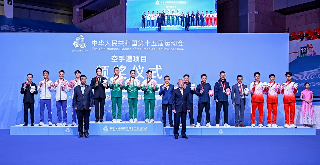 『第十五屆全國運動會』今(6)日在澳門賽區進行空手道項目,坐擁主場優勢的澳門隊首日比賽即傳來喜訊,郭建恆(KUOK KIN HANG)繼2021年西安全運會勇奪個人型銅牌,為澳門奪得歷史性獎牌後,今屆夥拍隊友鄭沘珞(CHEANG PEI LOK)及方文浩(FONG MAN HOU)在男子組團體型再造出好成績,決賽以42.7分擊敗香港隊摘金,為澳門參加全運會以來首面金牌。澳門特別行政區行政長官岑浩輝出席頒獎禮,親自為澳門運動員頒發獎牌。