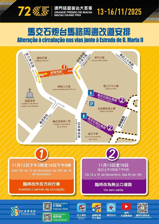 當中,11月12日(周三)至16日(周日),亞馬喇前地與城市日大馬路之間一段仙德麗街臨時由單向改為雙向交通、福海花園與新雅馬路行車天橋之間的一段新雅馬路臨時改作反方向通車。至於其他於賽事期間每日凌晨至傍晚時段封閉之賽道及周邊路口,會因應實際情況,於當天的賽事結束後儘早解封。