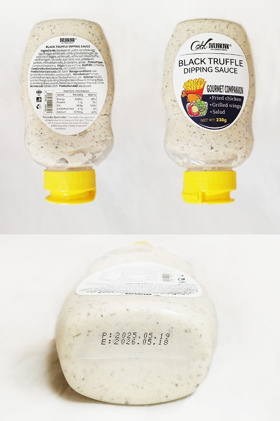 涉事預包裝蘸醬汁品牌為“菜墩墩”,產品名稱為“BLACK TRUFFLE DIPPING SAUCE”,淨重230克,批次為P: 2025.05.19 E:2026.05.18,產地為中國,該產品樣本被檢出山梨酸含量為每公斤一千二百毫克。