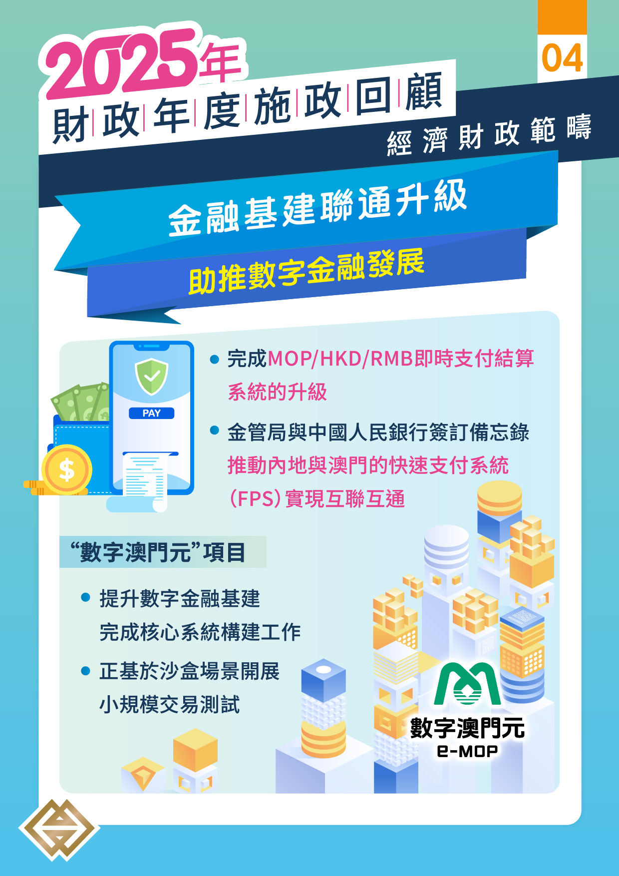 金管局今年內已完成港元和人民幣等涵蓋粵港澳大灣區(下稱“大灣區”)三種法定貨幣的即時支付結算系統升級,採用最新的國際交易報文標準,並加強災備能力,延長服務時間,進一步提升交易資金匯劃和風險應對能力。同時,金管局與中國人民銀行簽訂備忘錄,共同推動內地與澳門快速支付系統的互聯互通。此外,正按部署推進“數字澳門元”項目,以提升數字金融基建,現已完成核心系統的構建工作,並正基於沙盒場景開展小規模交易測試。