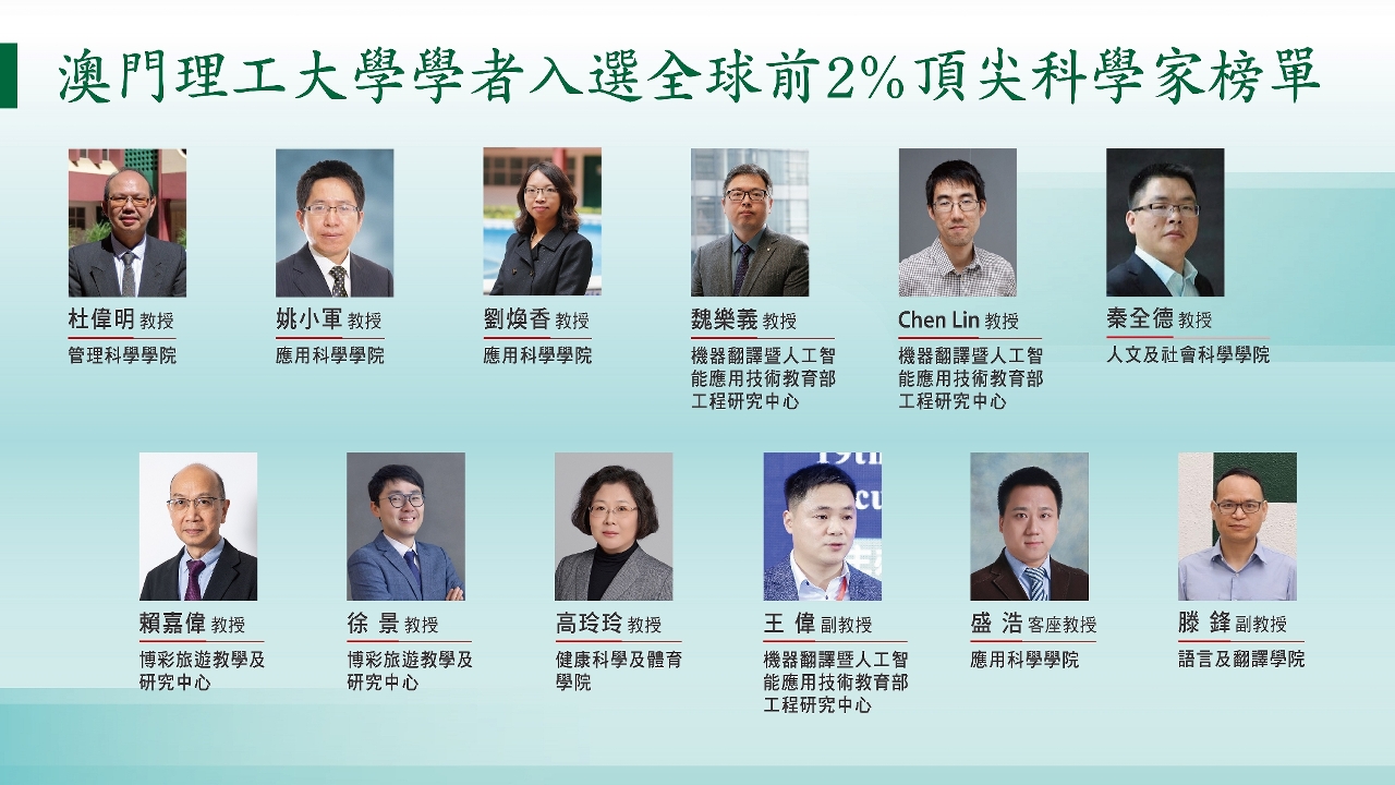 此次入選全球前2%頂尖科學家榜單的澳門理工大學學者分別為:教授杜偉明、姚小軍、劉煥香、魏樂義、Chen Lin、秦全德、賴嘉偉、徐景、高玲玲、副教授王偉、客座教授盛浩,以及副教授滕鋒。其研究範疇涵蓋多個前沿學科,包括:化學、資訊與通訊技術、人工智能與影像處理、智能與策略技術、護理、經濟與商業科學,以及傳播等多面向研究,顯示澳理大在多元領域的科研貢獻均獲國際認可。