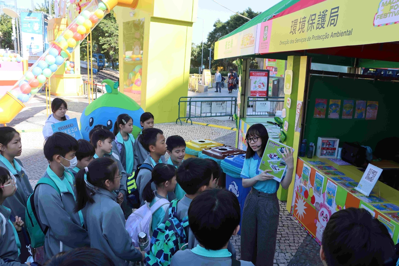 環境保護局舉辦“環境保護局吉祥物與您暢遊美食節”活動,組織了綠色學校澳門工聯職業技術中學約25位師生,於澳門美食節期間共同實踐減少使用一次性餐具、資源垃圾分類回收、廚餘回收、惜食等低碳行為。