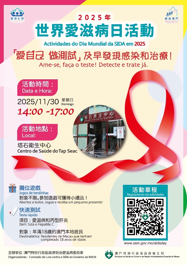 12月1日為“世界愛滋病日”,今年主題為“社會共治,守正創新,終結愛滋”(Overcoming disruption, transforming the AIDS response)。為加強居民對預防愛滋病的關注,提高安全性行為認識,衛生局將於11月30日下午2時至5時,在塔石衛生中心地面層舉行主題活動,提供免費、不記名的愛滋病病毒抗體及丙型肝炎病毒抗體快速測試,檢測時只需少量指尖血,完成檢測後即可獲得小禮品。活動對象為年滿18歲、不清楚自身感染狀況的澳門居民,現場領取籌號即可參與。此外,衛生局工作人員會在塔石衛生中心附近進行快閃互動的攤位遊戲,參加者可獲得小禮品,歡迎居民參加,活動詳情可瀏覽衛生局愛滋病關懷網“世界愛滋病日”專區(www.ssm.gov.mo/aidsday)。