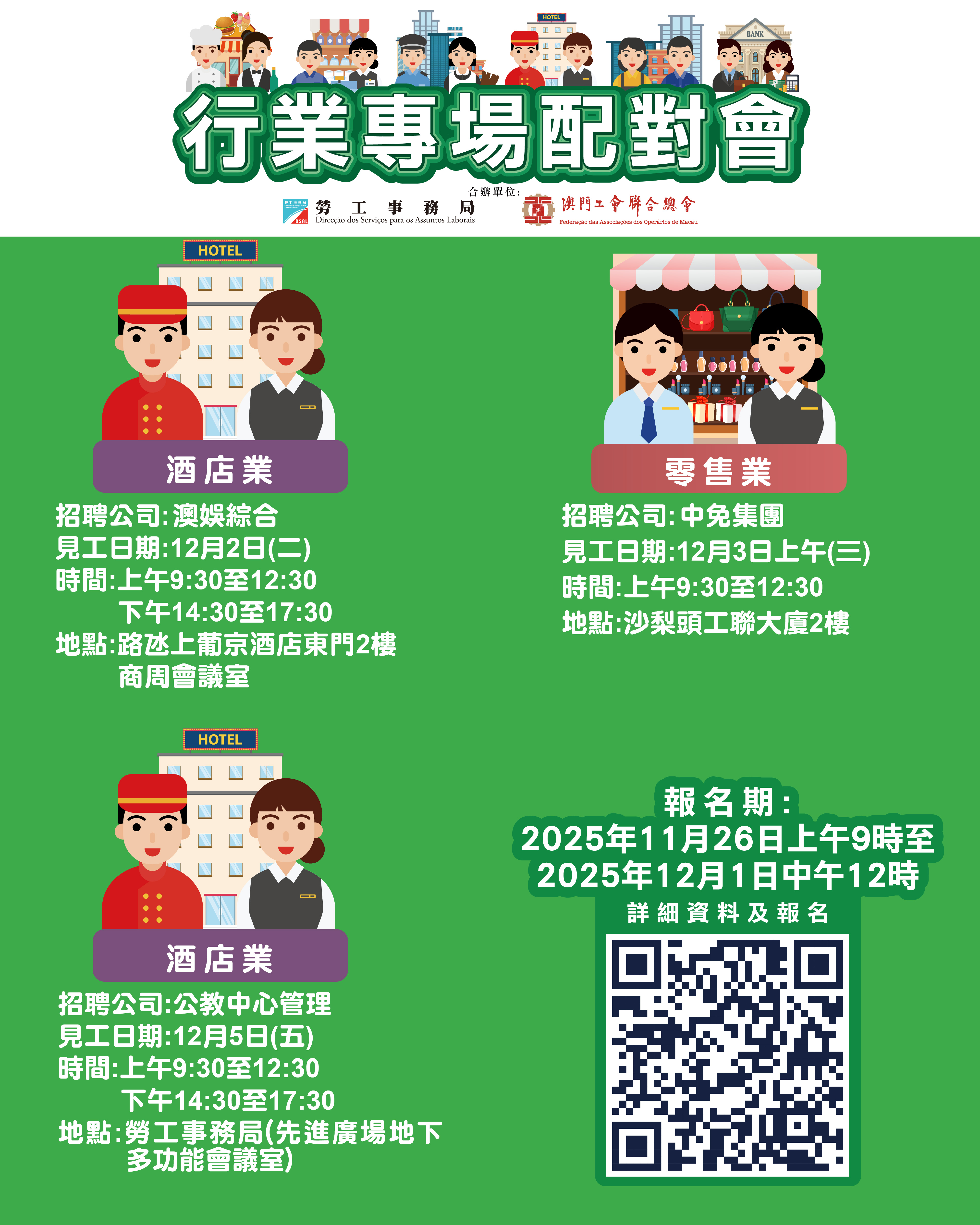 12月2日全日酒店業專場配對會在澳門上葡京酒店二樓商周會議室舉行;12月3日上午零售業專場配對會在澳門沙梨頭海邊街2-6號工聯大廈二樓舉行;12月5日全日酒店業專場配對會在澳門馬揸度博士大馬路221-279號先進廣場大廈地下勞工局多功能會議室舉行。三場配對會的報名日期由明(26)日上午9時至12月1日中午12時。