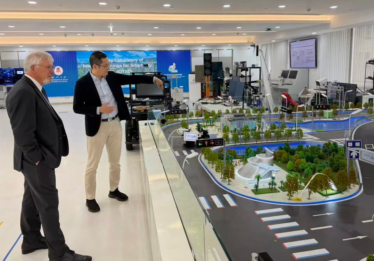 代表團參觀了澳大模擬與混合信號集成電路全國重點實驗室及智慧城市物聯網全國重點實驗室,深入了解澳大近年的科研成果、人才培養模式、科研發展佈局及橫琴合作區校區的建設計劃。Joe Chicharo對澳大的發展及科研成果給予高度評價。