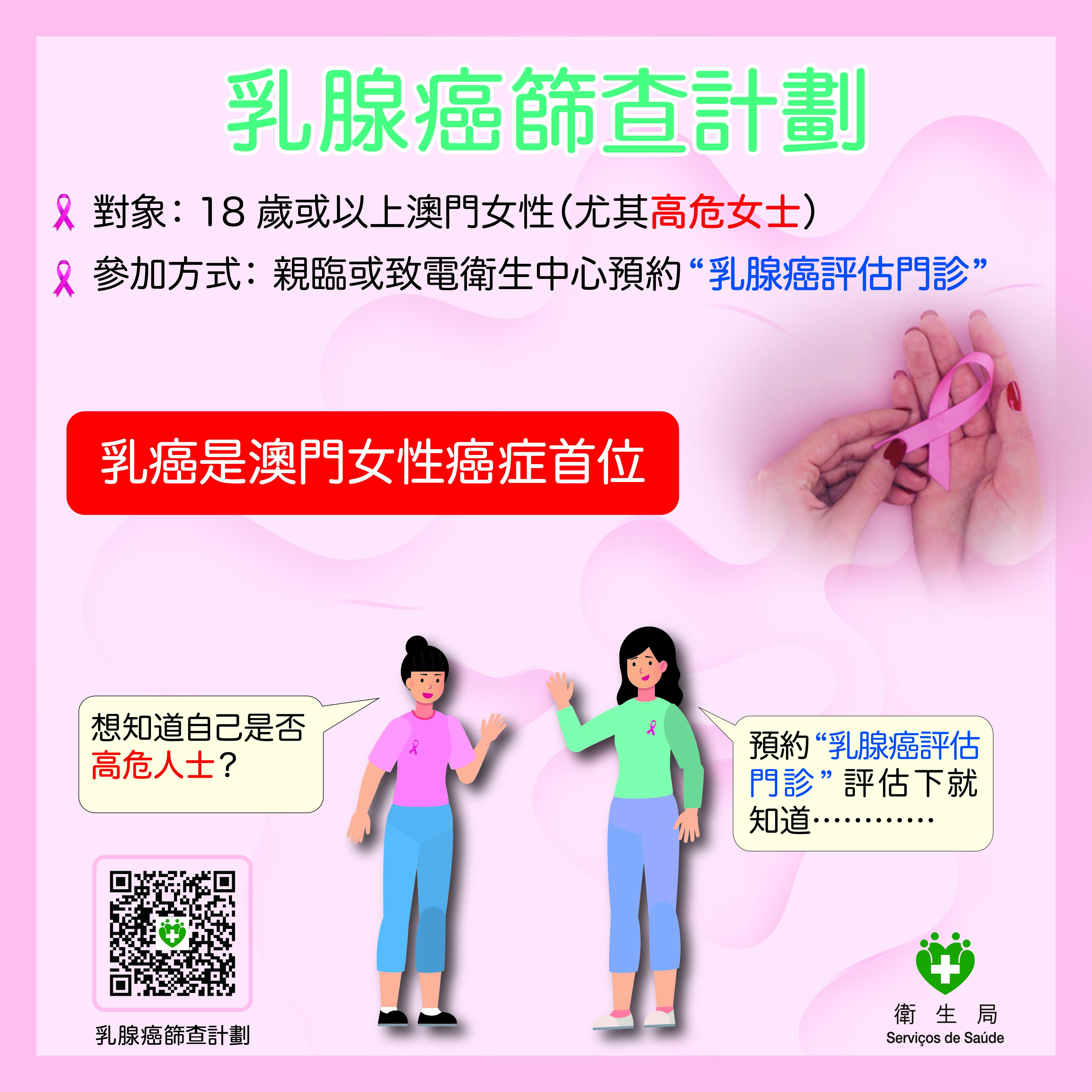 衛生局表示,乳腺癌和子宮頸癌為澳門女性常見的癌症,早期症狀多不明顯,難以察覺,定期篩查可及早發現癌前病變或早期癌症,實現“早預防、早發現、早診治”的目標,大幅提升治療效果及存活率,降低癌症死亡風險。居民可通過“一戶通”內“我的健康”的“綜合癌症篩查平台”進行風險評估,系統會根據個人的年齡、性別和問卷評估結果等,提出個體化的癌症篩查建議,並可在“平台”實現一站式預約子宮頸癌、大腸癌、乳腺癌和肺癌等主要癌症篩查服務及獲取更多相關資訊。而保持健康生活方式,包括健康飲食、規律運動、戒煙限酒及充足睡眠等,可有效降低罹患各類癌症的風險。