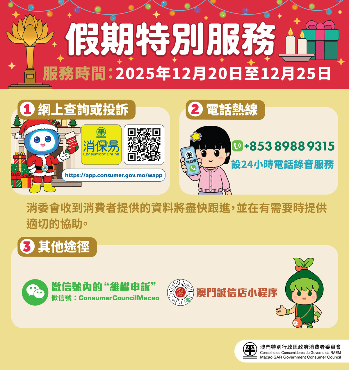 配合澳門特別行政區成立紀念日、冬至及聖誕節連假,為向消費者提供適切服務,消費者委員會(下稱消委會)由12月20日至25日一連六天設假期特別服務,期間消費者如有查詢或投訴,可透過“消保易”(https://app.consumer.gov.mo/wapp)或消委會的電話服務熱線:853-8988 9315(設24小時電話錄音服務)留下資料,消委會將盡快回覆,並在有需要時向消費者提供協助,以保障消費者權益。