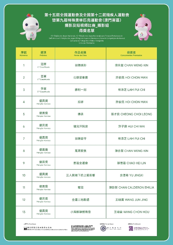 為響應“第十五屆全國運動會及全國第十二屆殘疾人運動會暨第九屆特殊奧林匹克運動會(澳門賽區)”(下稱“十五運會及殘特奧會”)在澳門特別行政區舉辦賽事,由文化局與十五運會及殘特奧會澳門賽區籌備辦公室聯合主辦、澳門攝影學會協辦的“十五運會及殘特奧會”攝影及短視頻比賽已圓滿結束,比賽收到約200份參賽作品,經評審團評選,現公佈冠軍、亞軍、季軍及優異獎得獎名單。