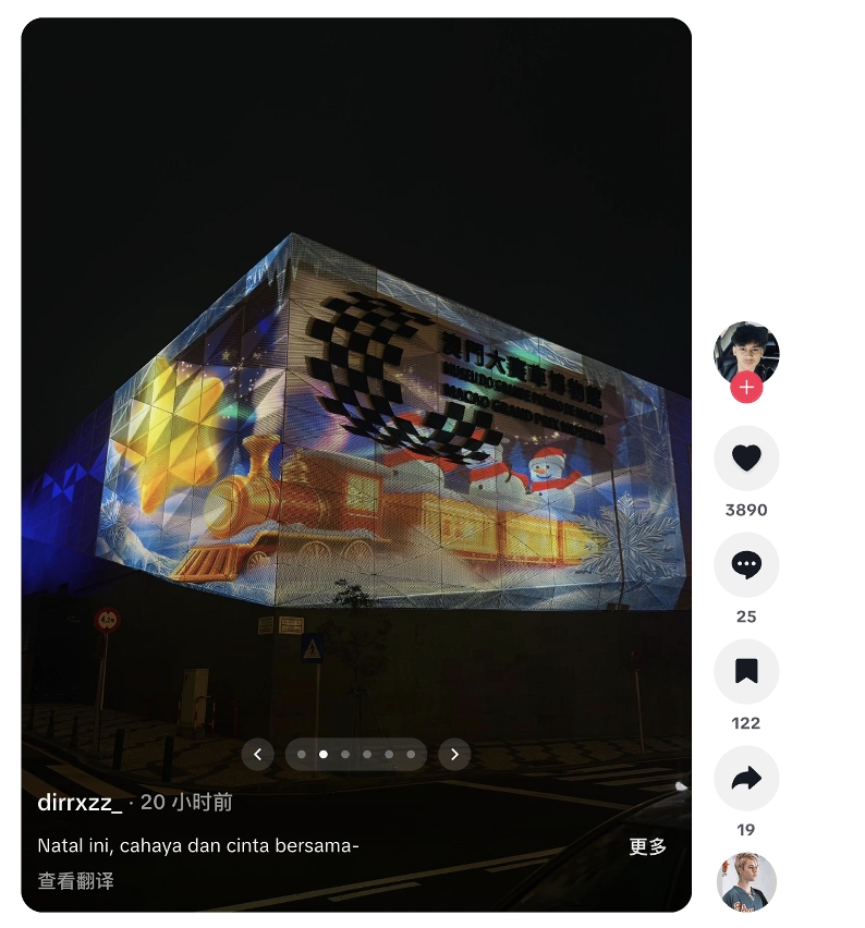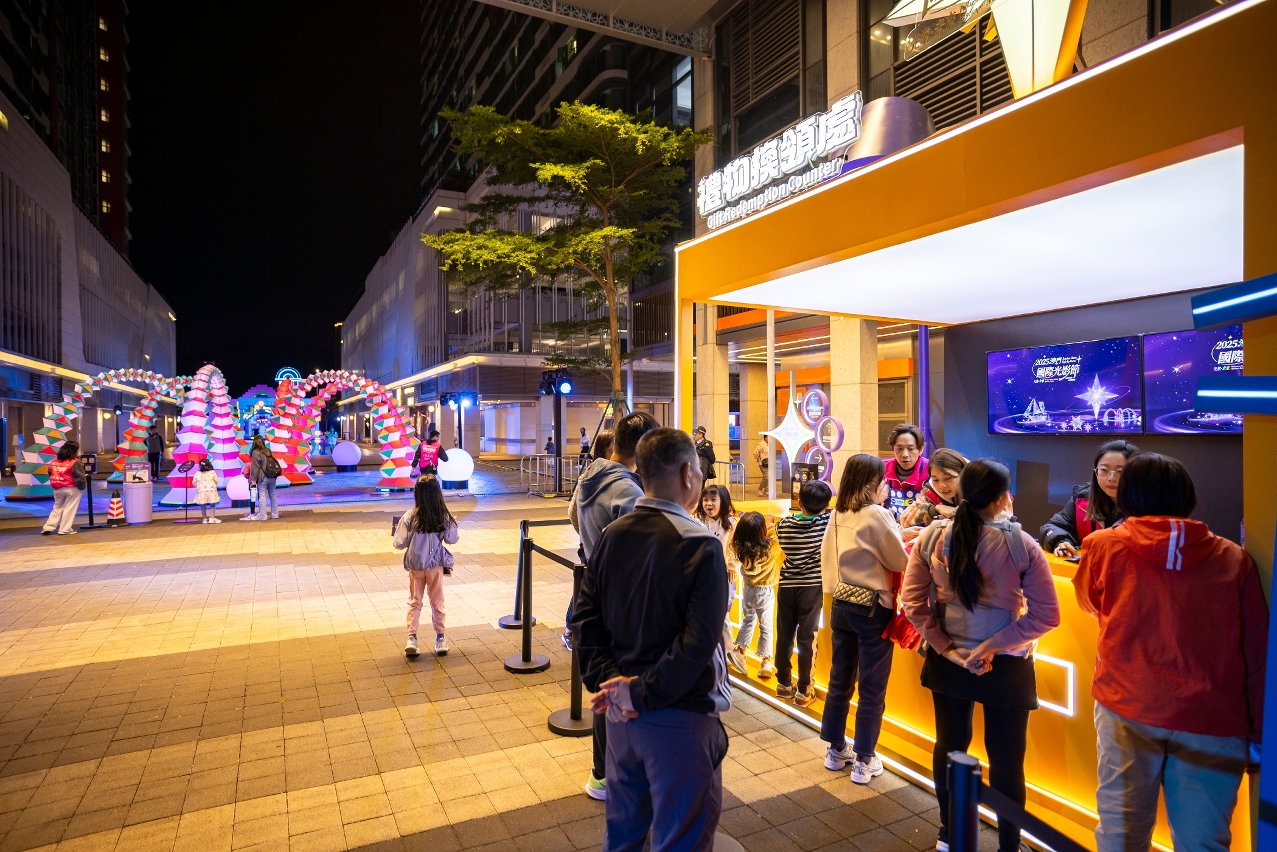 “2025澳門國際光影節三大展區共設28組燈光、互動和燈飾裝置,由澳門、內地、葡萄牙、韓國、澳大利亞和美國的創作團隊聯手打造,展現本地創意與國際視野。同時,澳門大賽車博物館立面呈現創意3D光雕表演奇幻旅程・澳門故事
