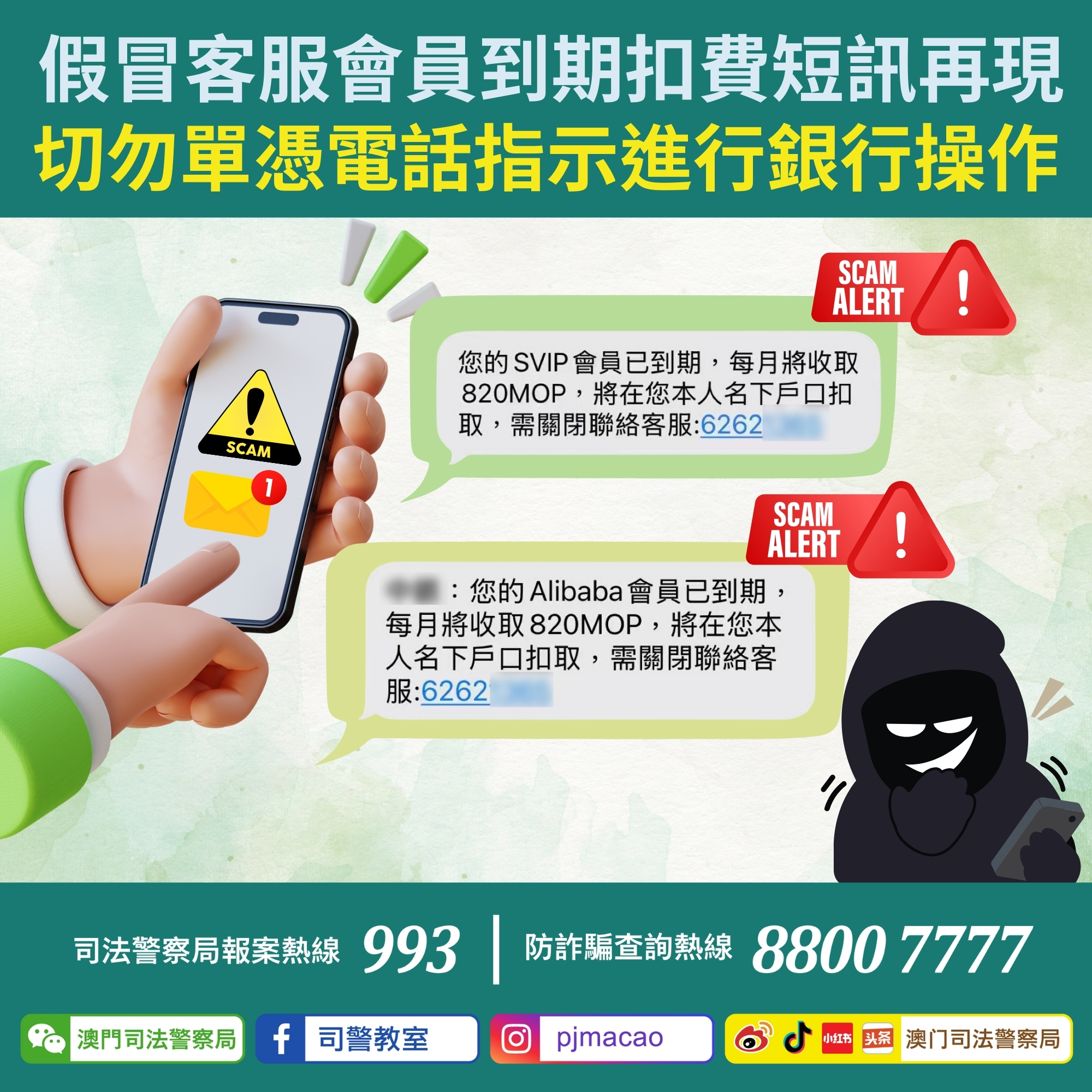 • 司警局提醒假冒客服會員到期扣費短訊再現 切勿單憑電話指示進行銀行操作
