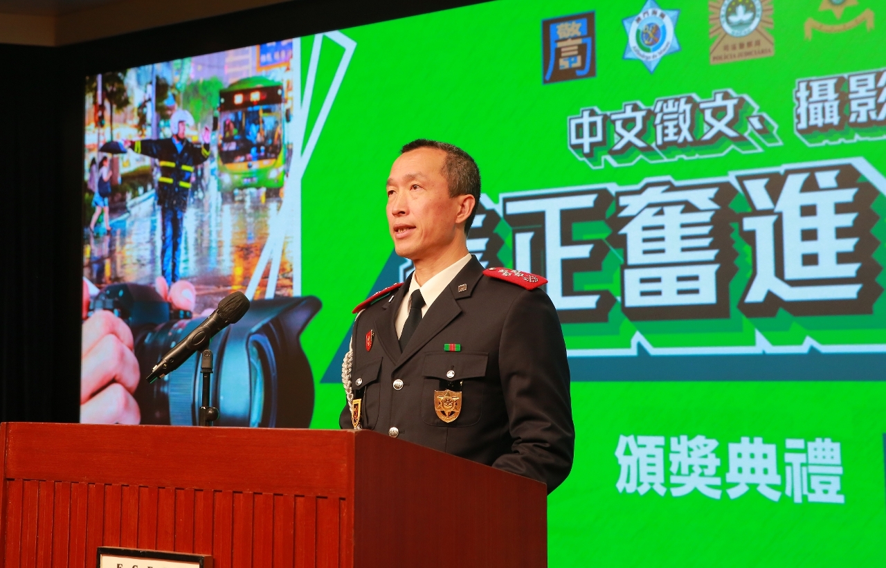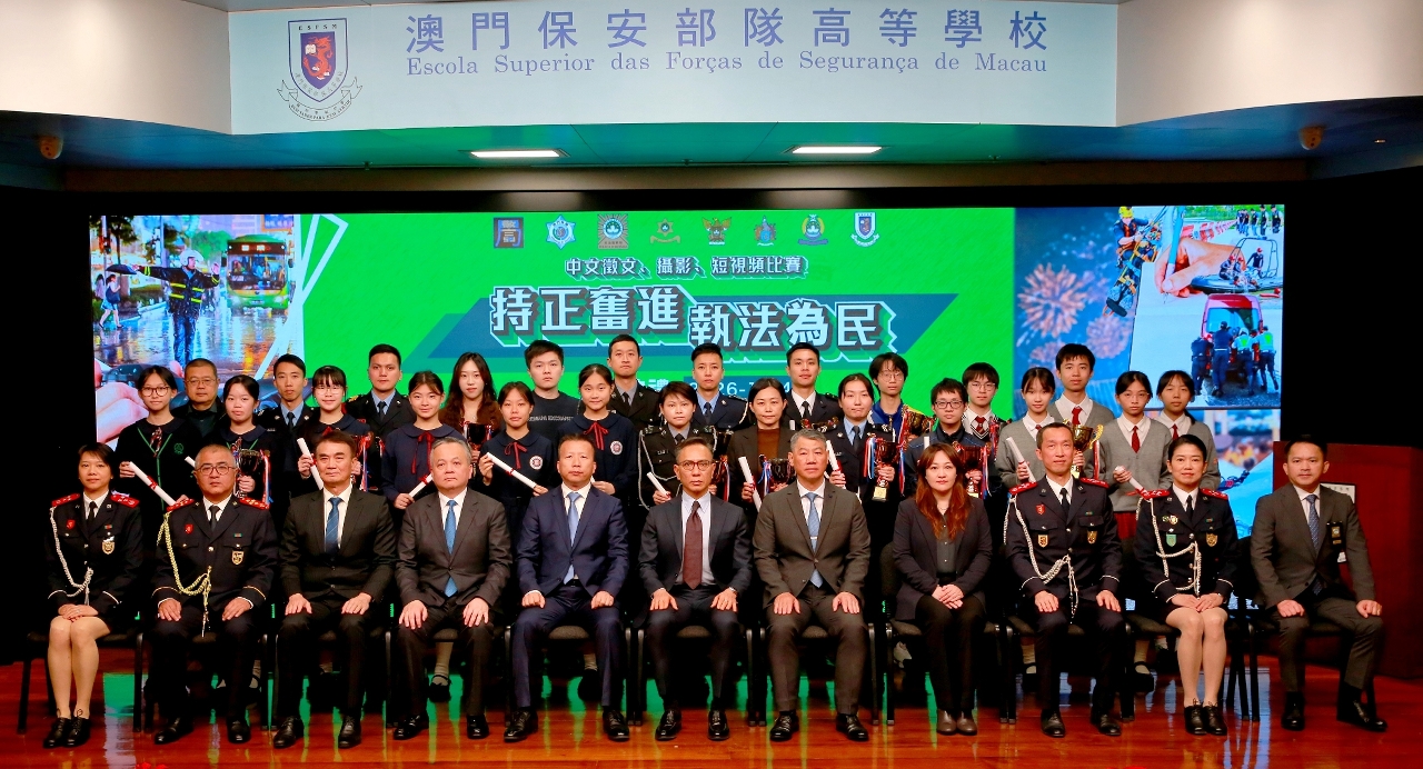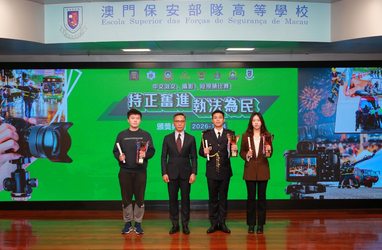 1月14日,由澳門保安部隊及保安部門合辦、澳門保安部隊高等學校(下稱“保安高校”)承辦的“持正奮進 執法為民”中文徵文、攝影及短視頻比賽,在保安高校舉行頒奬禮。保安司司長陳子勁擔任主禮嘉賓,並邀請中聯辦警務聯絡部部長王前進、警察總局局長梁文昌、澳門海關關長何浩瀚、校董會成員、保安部隊及保安部門各領導、學術及教學委員會成員、賽事評委、各組別的得獎者,以及高等院校和中學代表等約180人出席,共同觀賞各位得獎者的精彩作品和見證榮耀時刻。