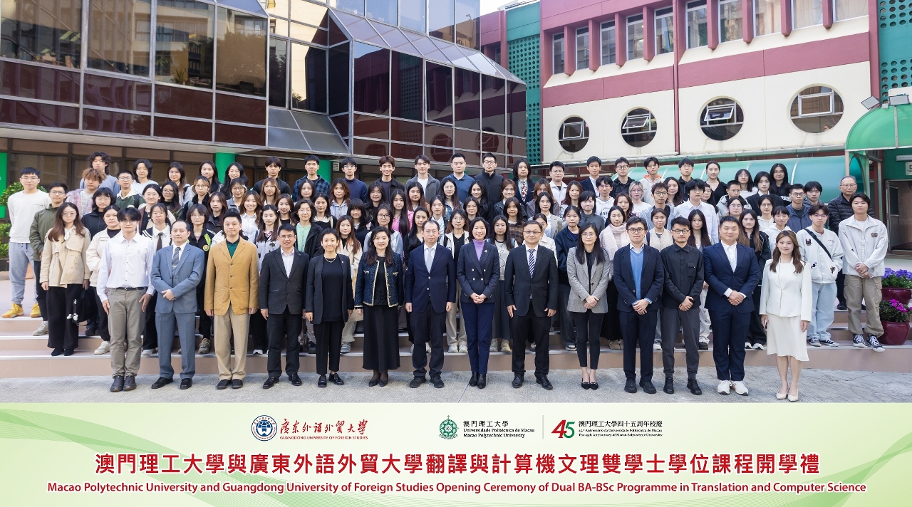 在《粵港澳大灣區發展規劃綱要》發佈七周年之際,澳門理工大學與廣東外語外貿大學合辦的“翻譯及計算機文理雙學士學位課程開學禮”在澳理大舉行,歡迎廣外—澳理大合作辦學項目首屆學生開啟澳門段學習新旅程。澳理大代校長李雁蓮、廣外副校長申明浩、兩校項目負責人,以及課程學生一百多人出席典禮,共同見證項目踏上新台階。